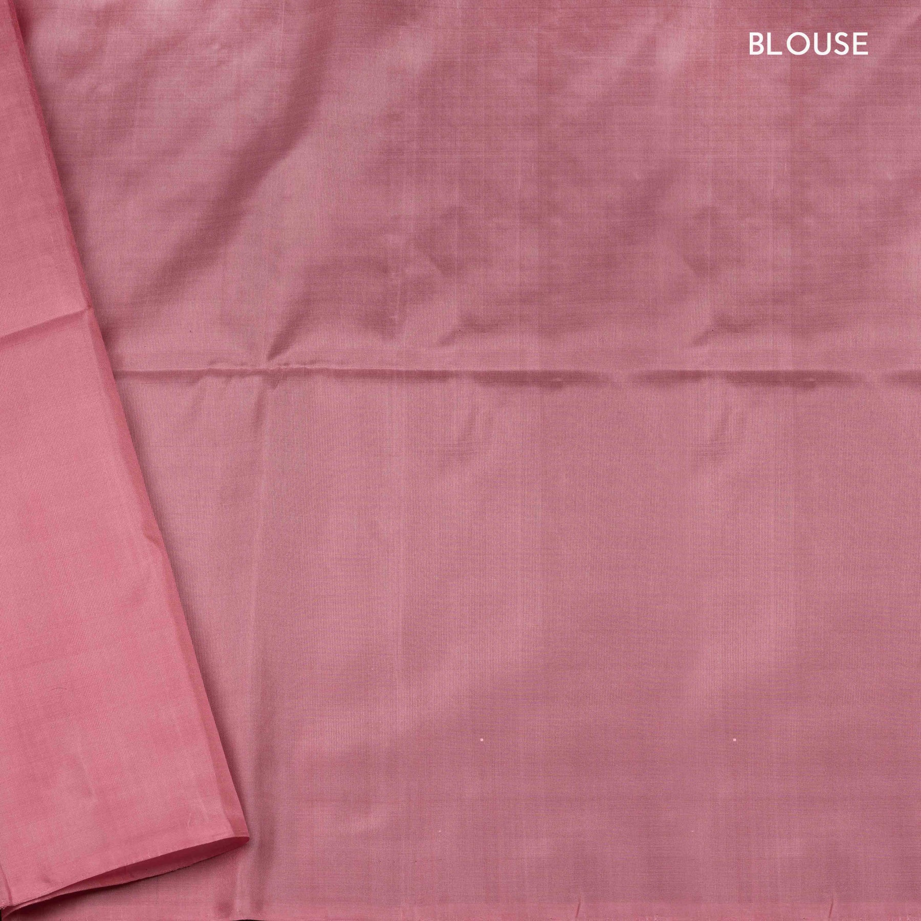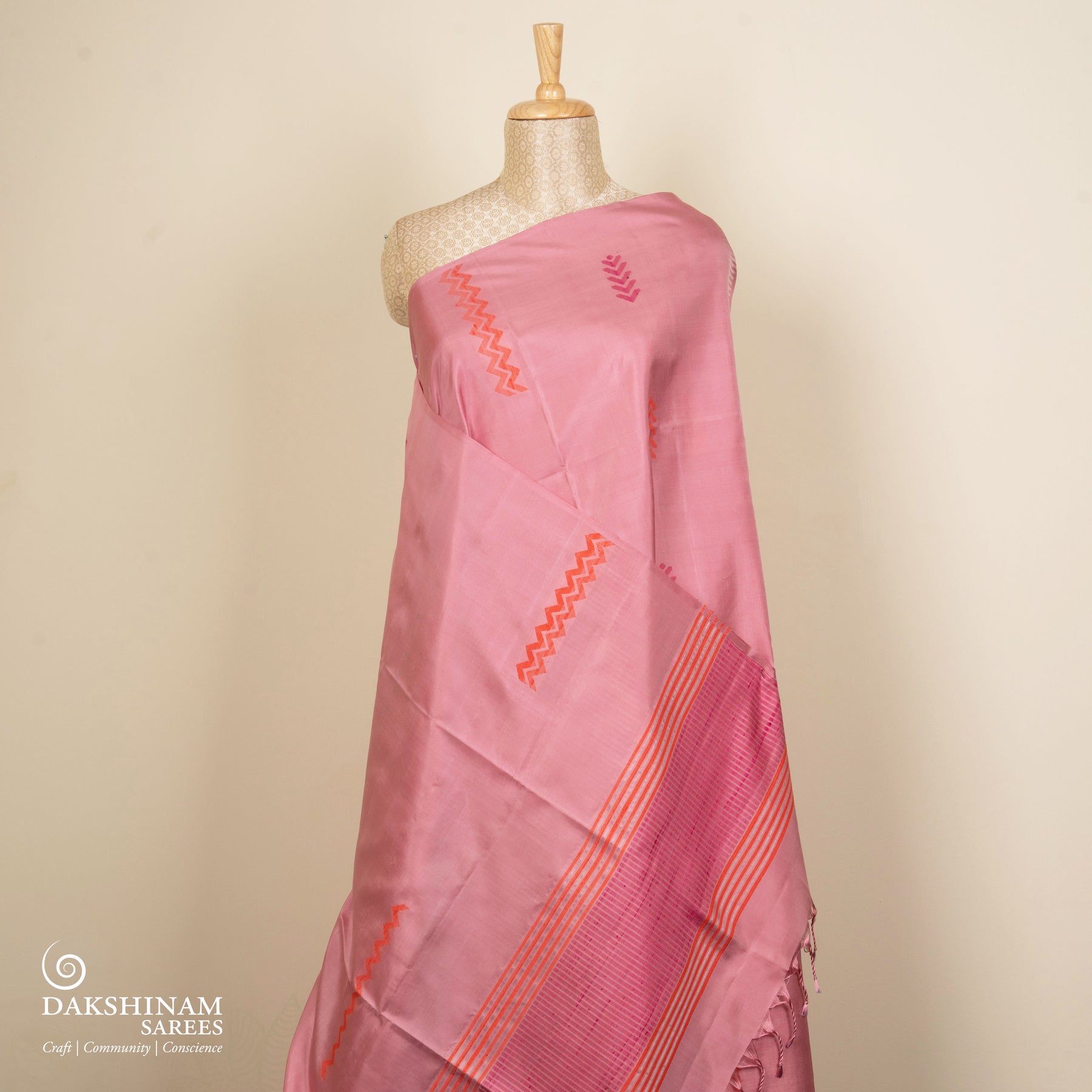 This elegant borderless soft silk saree comes in a soothing light pink shade that highlights its refined and contemporary appeal. The body features delicate dotted lines along with geometric square and rectangular patterns woven using orange-pink threads and shimmering silver zari, giving the saree a subtle textured look. The pallu is beautifully designed with striped patterns created using orange and pink threads along with silver zari accents. Paired with a plain pink blouse, this lightweight soft silk saree is perfect for elegant occasions, festive gatherings, and graceful everyday wear.