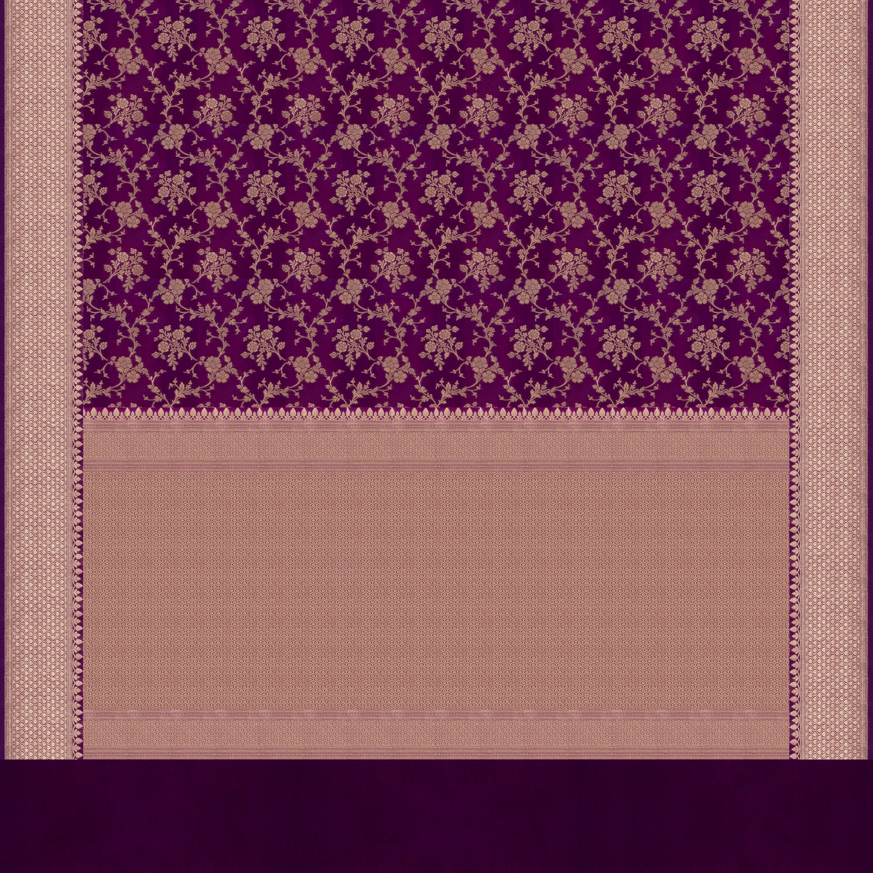 Experience refined elegance with this exquisite Banarasi silk saree in a regal purple hue. The body is richly adorned with an all-over floral jaal woven in luminous gold zari, creating a graceful and opulent canvas. The monotone border features intricate jharokha-inspired patterns highlighted with leaf motifs, flowing vines, and delicate zari stripes that enhance its traditional charm. The pallu mirrors the border design, lending a beautifully cohesive and grand finish to the saree.