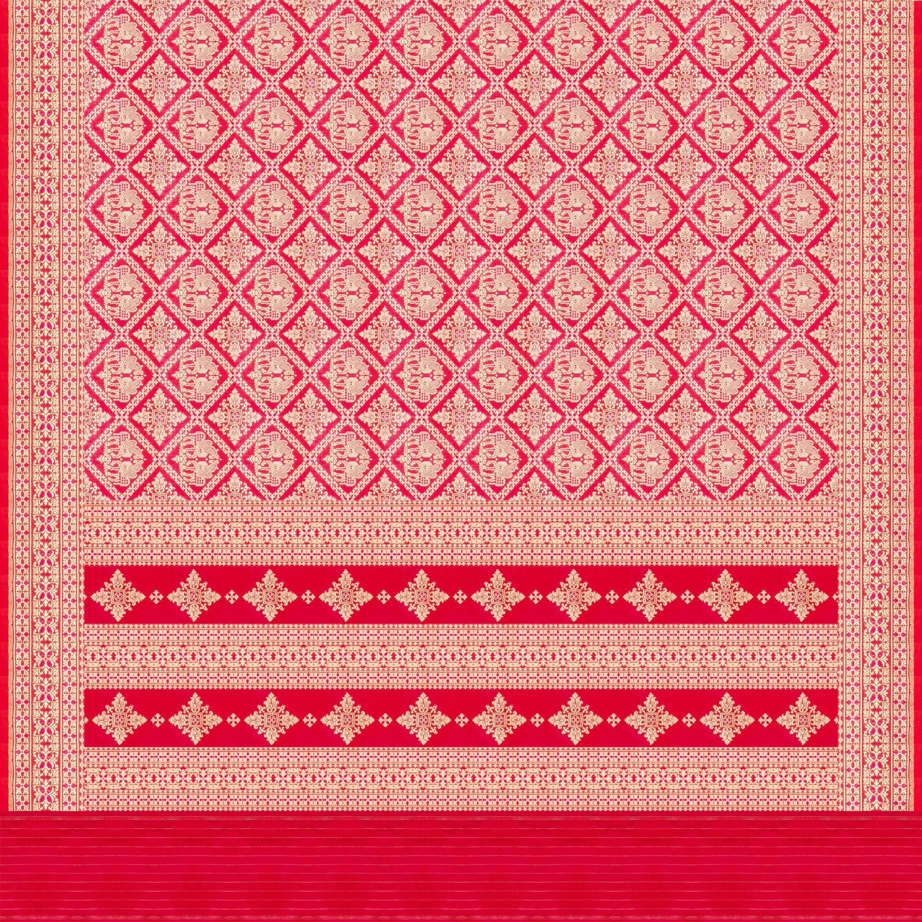 Embrace timeless bridal elegance with this exquisite Banarasi silk saree in a classic red hue. The body is beautifully woven with diamond-shaped patterns intricately nestled with meenakari-highlighted horse and floral motifs, symbolising tradition and grandeur. The monotone border features rich floral zari detailing, while the pallu mirrors the border’s elegance with diamond floral patterns woven in lustrous gold zari, creating a cohesive and regal finish.
