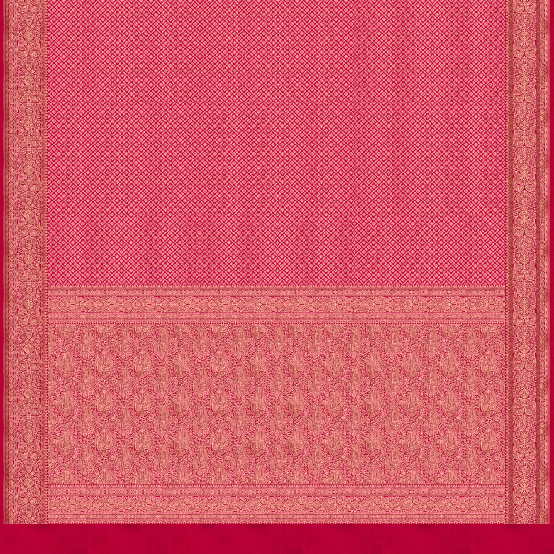 This elegant Banarasi silk saree features a graceful pink body richly woven with brocade work, showcasing classic diamond and vaira mookuthi buttas that add a regal touch. The beautifully designed border highlights traditional paisley motifs along with dotted patterns and malli moggu detailing, enhancing its heritage appeal. The pallu continues the same intricate border design with added paisley and floral motifs, creating a rich and harmonious look. Paired with a plain pink blouse with a running border, this saree is perfect for weddings, bridal wear, and grand festive occasions.