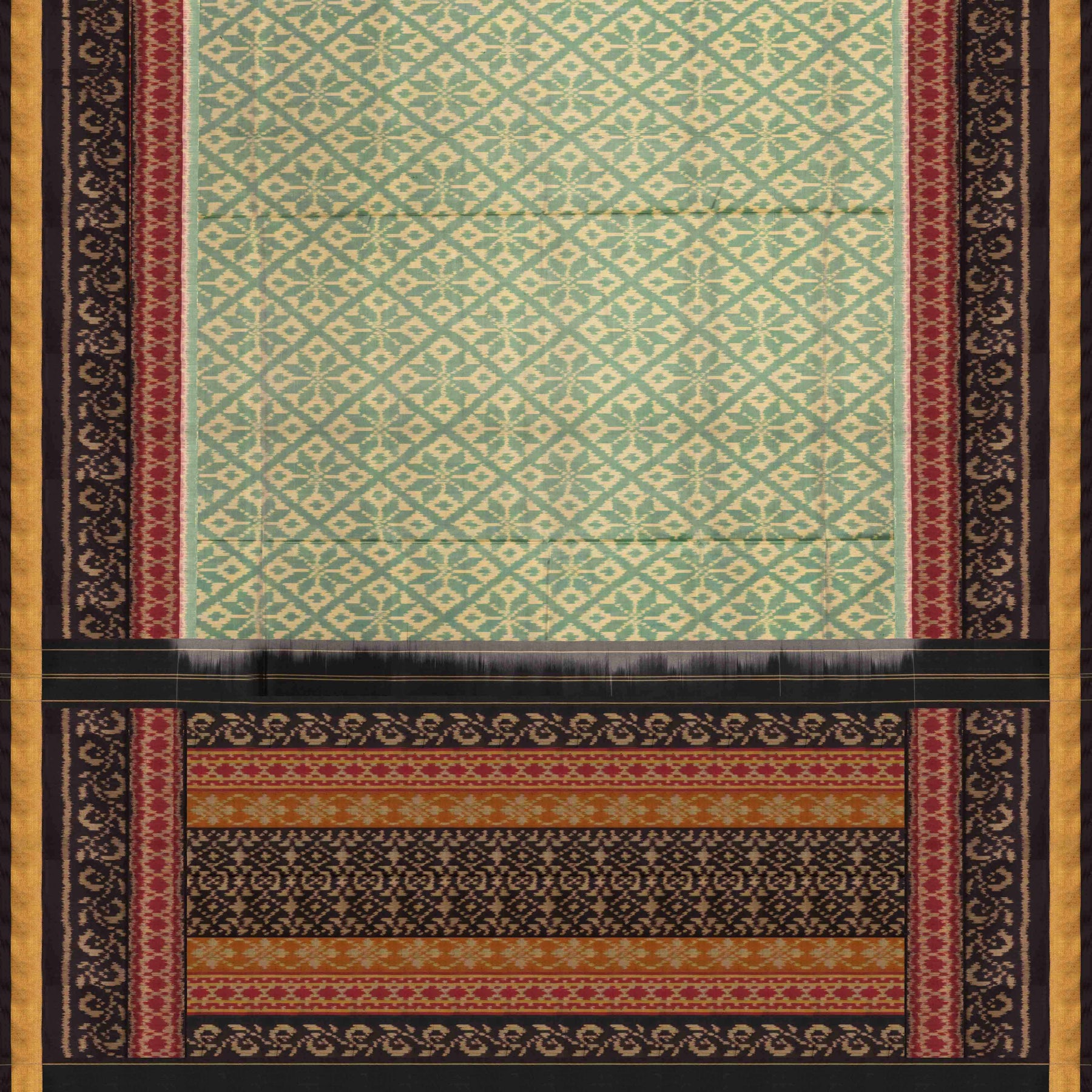 Gracefully handwoven, this Rajkot Ikat silk saree in a refined beige base is beautifully adorned with diamond and floral motifs in green, showcasing the intricate artistry of the Ikat dyeing technique. The dual-toned border in black and maroon features elegant leaf vines and circular patterns, adding definition and contrast. The black pallu is striking with its central maroon and orange bands, further enriched by floral, leaf vine, and diamond designs. A perfect blend of tradition and richness, the saree is highlighted with subtle gold zari accents and comes with a plain black blouse piece. Ideal for festive occasions or elegant gatherings.
