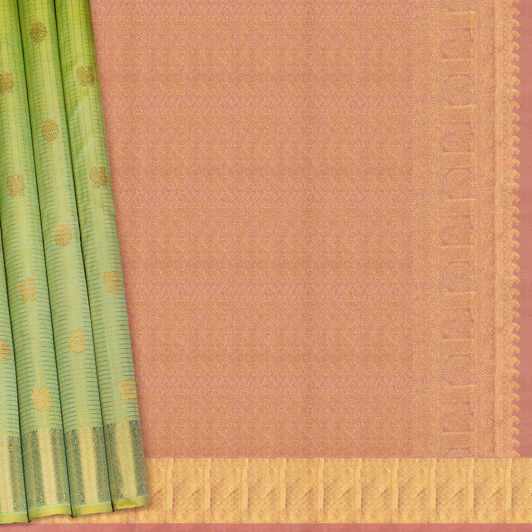 Delicate yet grand, this light green Kanjivaram silk saree is a graceful celebration of South Indian heritage. The body is adorned with kattam (checkered) patterns, enriched with elegant peacock and chakram motifs woven in radiant gold zari. The self-colored border showcases diamond checks, florals, heart-shaped leaves, and stripes, lending intricate detail and a traditional aesthetic. A contrasting dusty pink pallu elevates the look with its exquisite display of paisleys, chevrons, floral vines, peacocks, chakrams, and diamond floral motifs, creating a rich visual tapestry. This saree is paired with a dusty pink blouse featuring the same elegant zari border, making it a complete and cohesive ensemble for weddings, festivals, or special celebrations.