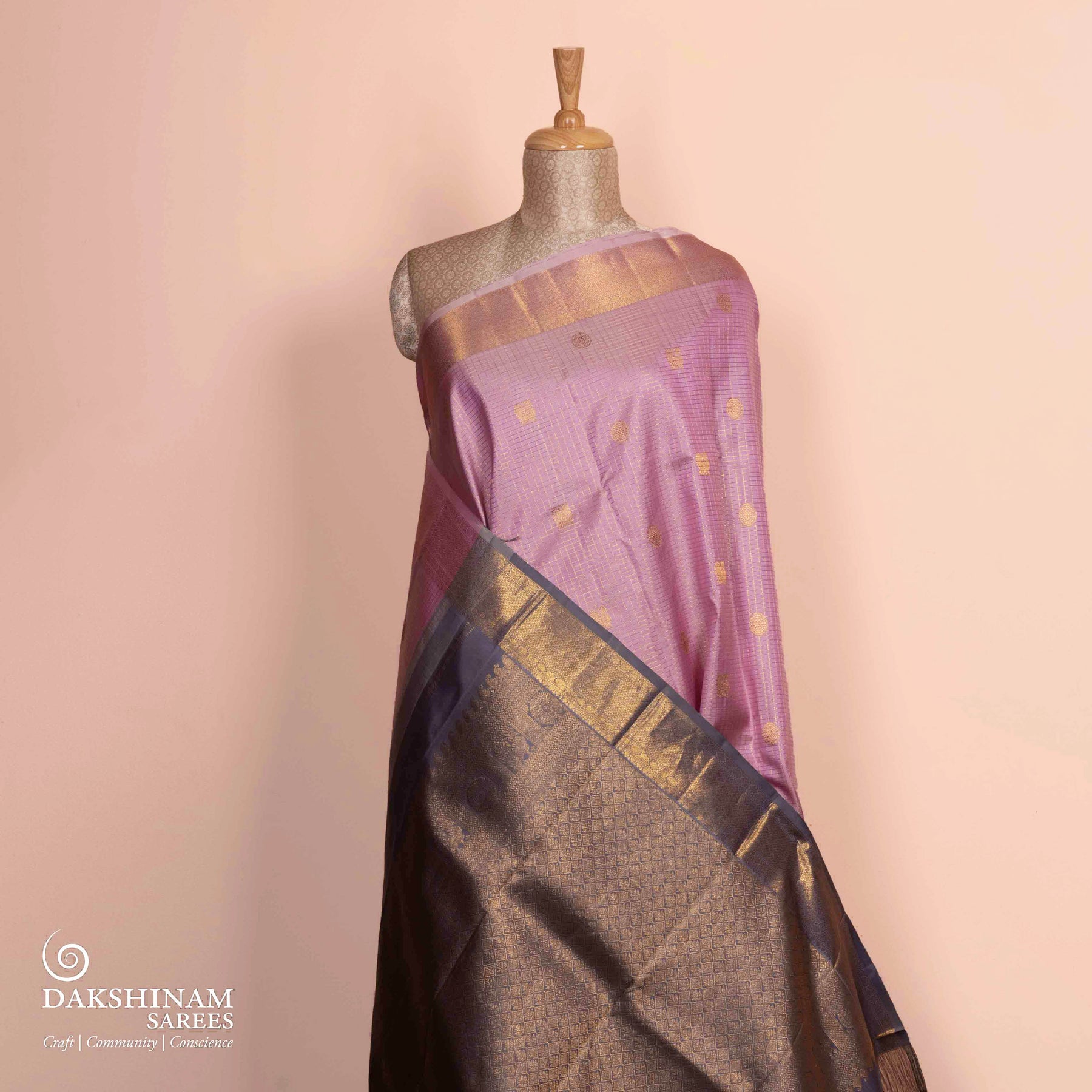 A soft symphony of colors and tradition, this pastel pink Kanjivaram silk saree blends grace with grandeur. The body features classic kattam (checked) patterns adorned with majestic peacock and chakram motifs, symbolizing beauty and auspiciousness. The matching pink border is intricately woven with diamond checks, floral motifs, heart-shaped leaves, and stripes that bring a subtle richness to the saree. A stunning contrast is introduced through the grey pallu, lavishly embellished with paisleys, chevron patterns, floral vines, peacocks, chakram, and diamond-shaped floral motifs, all highlighted in radiant gold zari. Completing the ensemble is a grey blouse with matching borders, creating a look that is both traditional and sophisticated—perfect for weddings, festivals, and special occasions.