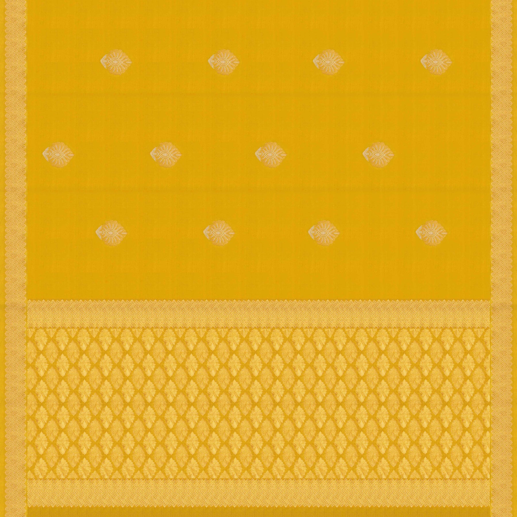 Brighten your festive wardrobe with this elegant Mubarakpur Banarasi silk saree in a cheerful mustard yellow hue. The lightweight handloom body is adorned with neatly spaced traditional buttas, lending it a graceful and airy appeal. The monotone border and pallu feature an exquisite diamond jaal pattern woven in soft gold and silver zari, complemented by subtle geometric detailing that enhances its refined charm. Ideal for day functions, festive gatherings, and intimate celebrations, this saree beautifully blends comfort with classic Banarasi elegance.