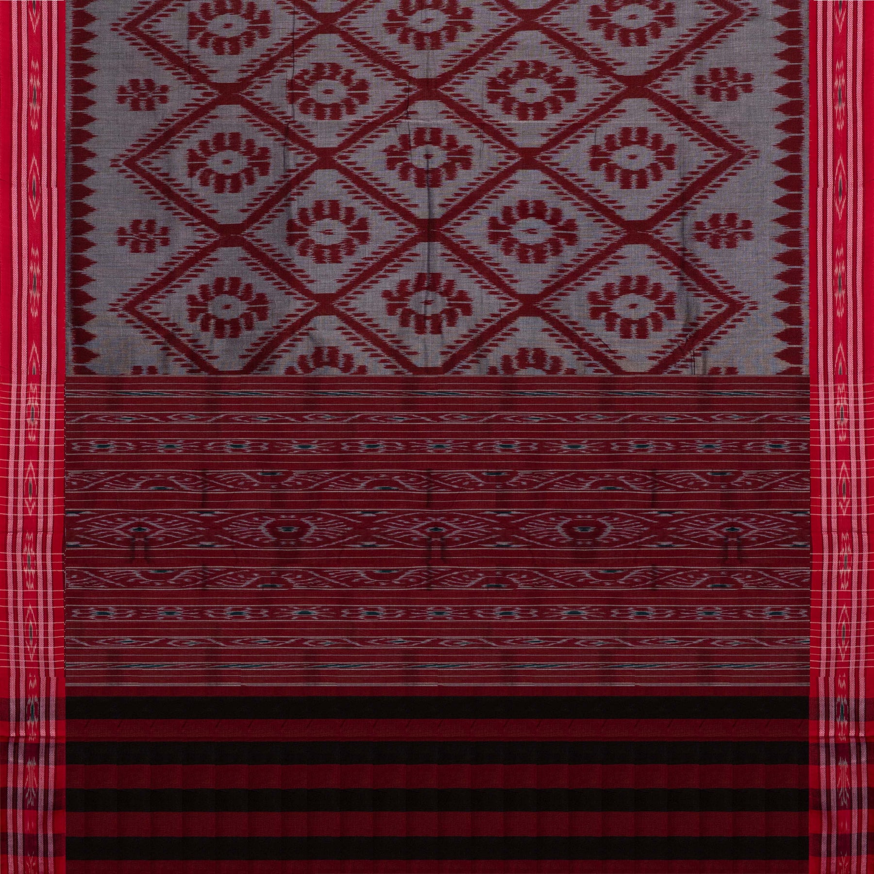 Elegant and rooted in tradition, this grey ikat cotton saree blends classic charm with modern versatility. The body features finely woven diamond and floral ikat motifs, with triangular patterns emerging near the edges. A striking red border is adorned with florals and diamond patterns, while the rich maroon pallu showcases intricate stripes, floral designs, and graceful leaf-vine motifs. Woven in the ikat technique, this lightweight and zari-free saree is a beautiful choice for everyday elegance or cultural occasions.
