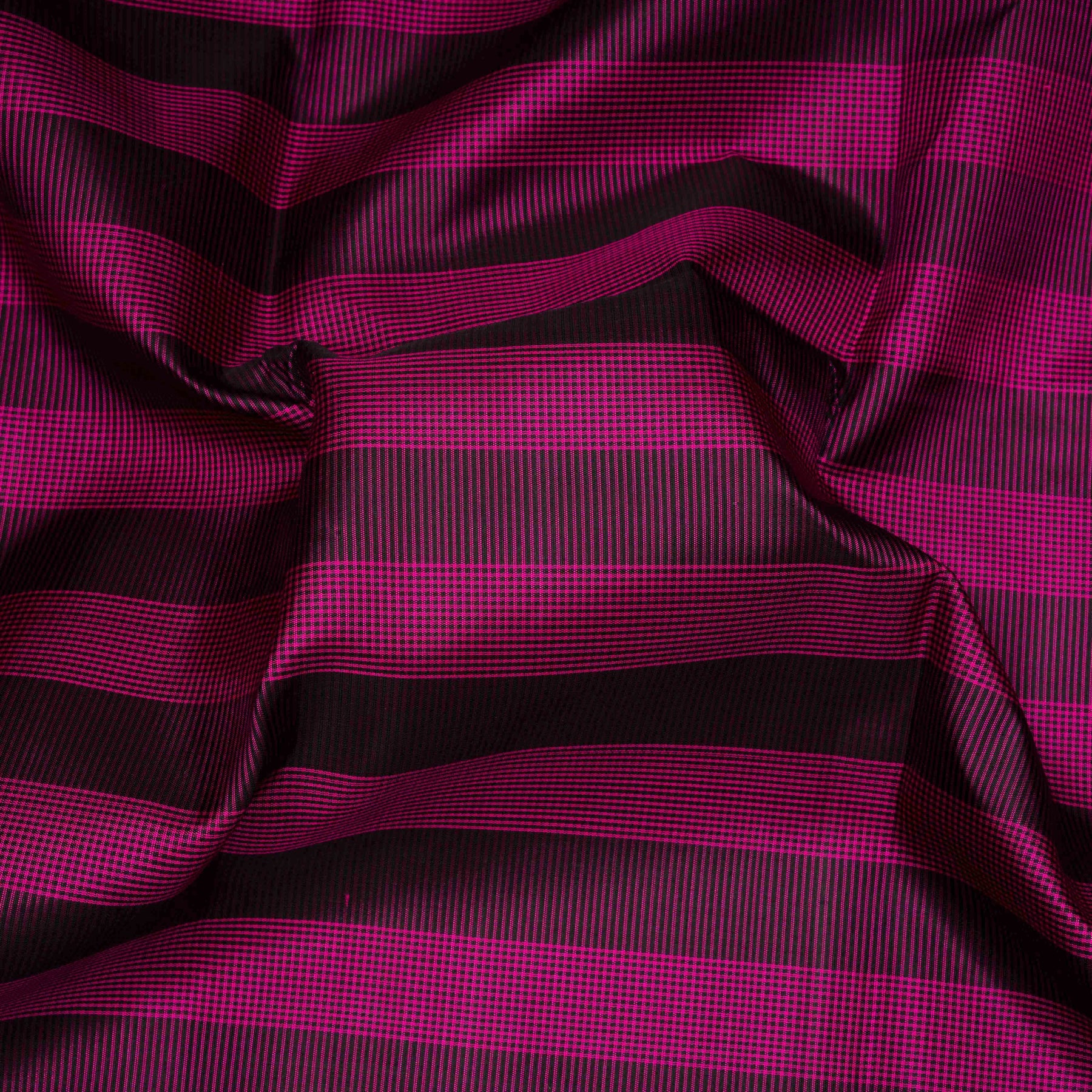Add a vibrant touch to your ethnic collection with this stunning magenta handwoven Kanjivaram silk saree. Designed with elegant black checks on the border and a unique combination of checkered and horizontal panel patterns in dark pink and black across the body, this saree offers a contemporary twist to tradition. The pallu features a beautiful pink base with striking striped borders in black and pink, enhancing its visual appeal. Paired with a pink blouse with a striped border, this saree is perfect for weddings, festive occasions, and traditional South Indian celebrations. A stylish addition to the original Kanjivaram silk saree collection.