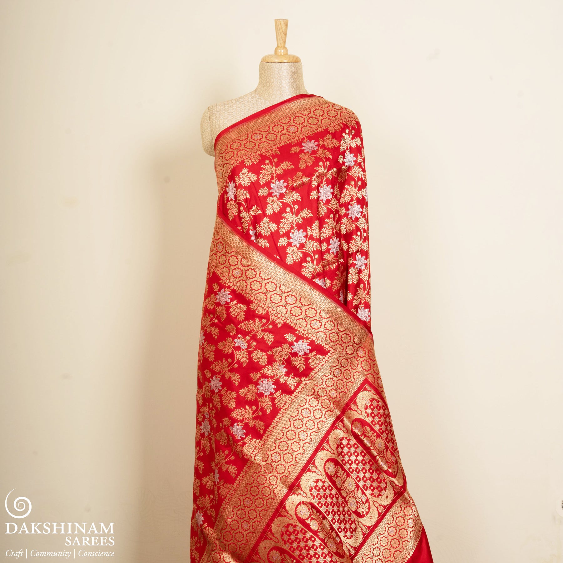 Celebrate timeless bridal elegance with this rich red Banarasi silk saree, beautifully adorned with an all-over floral and leaf jaal woven in shimmering gold and silver zari. The monotone border features intricate geometric jaal with delicate floral buttas, adding refined depth to the design. Completing the look, the grand pallu showcases elongated paisley and floral panels highlighted in gold and silver zari, lending a classic Banarasi grandeur. Ideal for weddings, bridal trousseaus, and festive occasions, this saree reflects the richness of traditional handloom artistry.