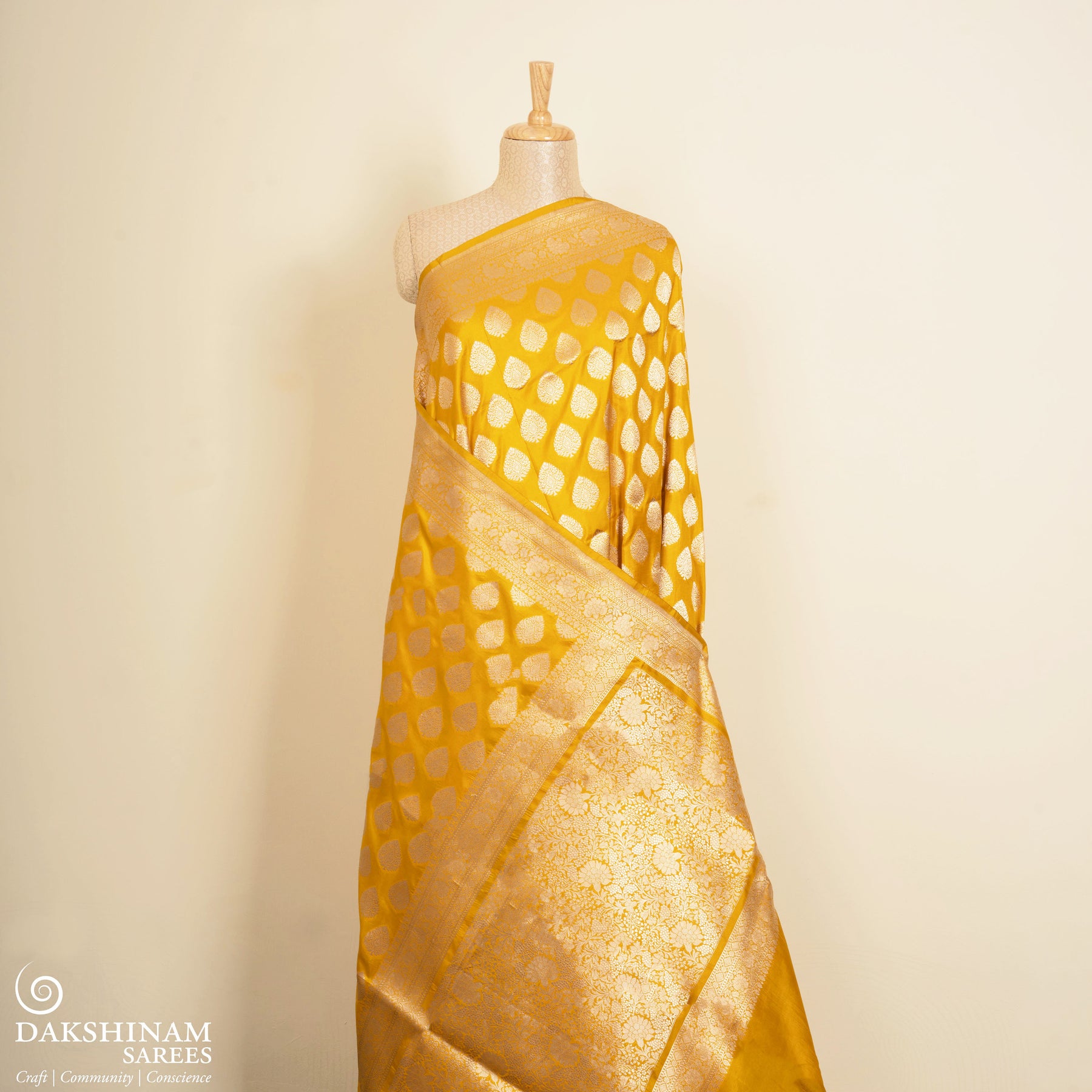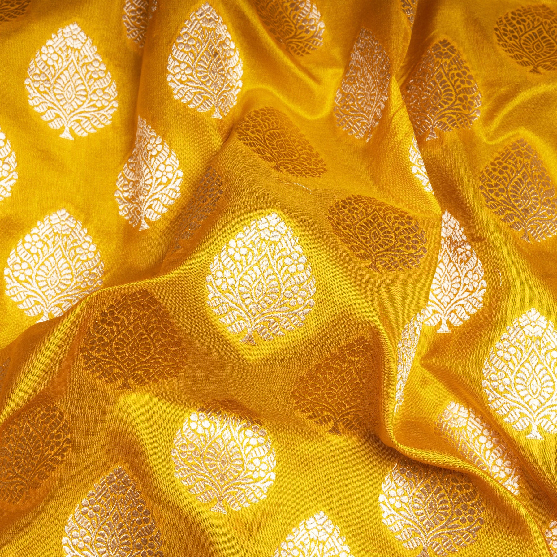 Radiate festive elegance with this classic Banarasi silk saree in a vibrant yellow hue, beautifully woven with an all-over Tree of Life butta pattern in rich gold zari. The monotone mustard-yellow border is enhanced with intricate floral vines and fine geometric zari detailing, while the pallu showcases dense floral creepers crafted in traditional Banarasi weaving. Luxurious yet timeless, this saree is an ideal choice for weddings, festive celebrations, and traditional occasions, reflecting the grandeur of pure handloom Banarasi craftsmanship.