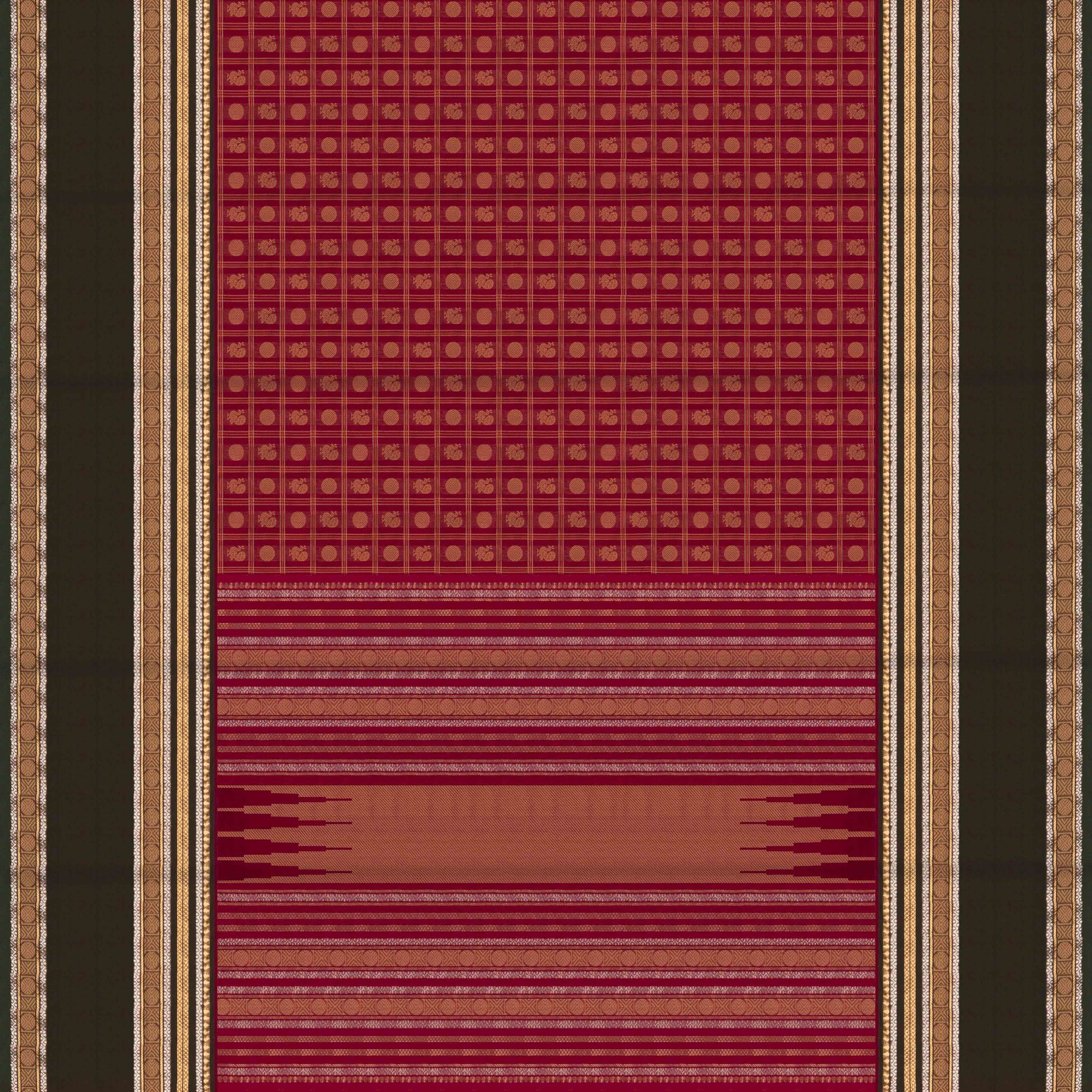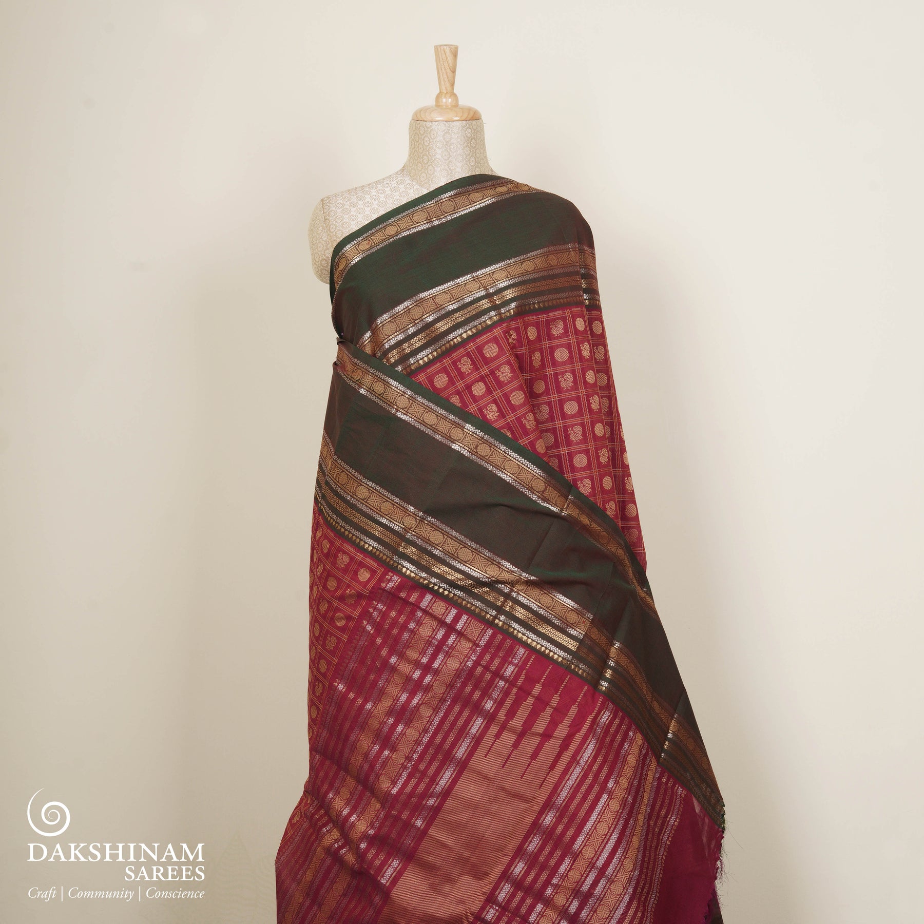 This elegant magenta Kanchi cotton saree features a classic checked body adorned with alternating rudraksham and mayil butta motifs, creating a rich traditional appeal. The magenta and green border is detailed with rudraksh butta, chevron design, thilagam and dotted patterns, enhancing its heritage charm.