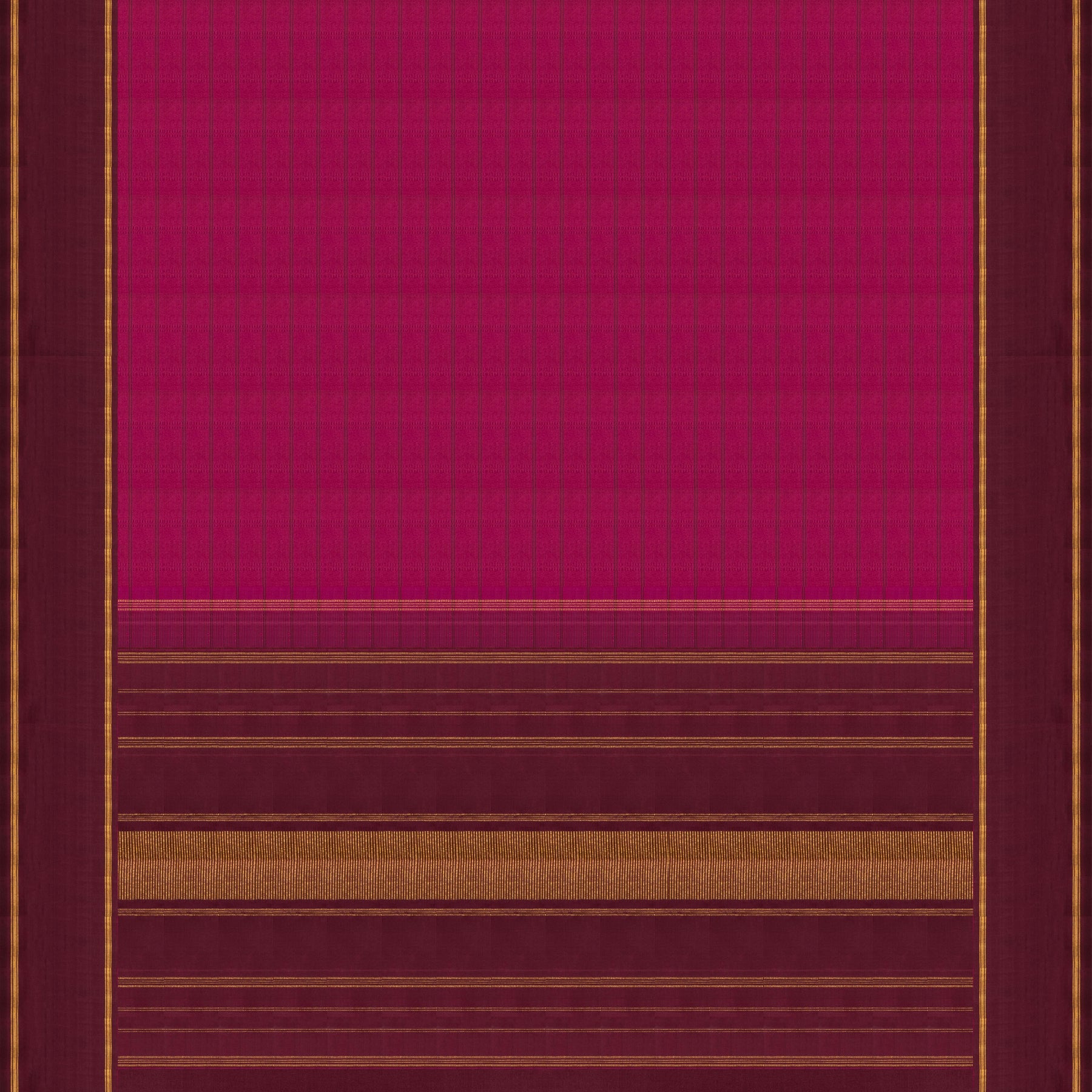This elegant magenta Kanjivaram silk saree features classic checks woven across the body, creating a timeless and traditional look. The contrasting maroon border is enhanced with gold zari rettapet line detailing, adding richness and definition. The pallu is designed with clean striped lines, giving a balanced and refined finish. Ideal for weddings and festive occasions, this saree reflects authentic South Indian craftsmanship. It comes with a plain maroon blouse paired with a running border for a complete ensemble.