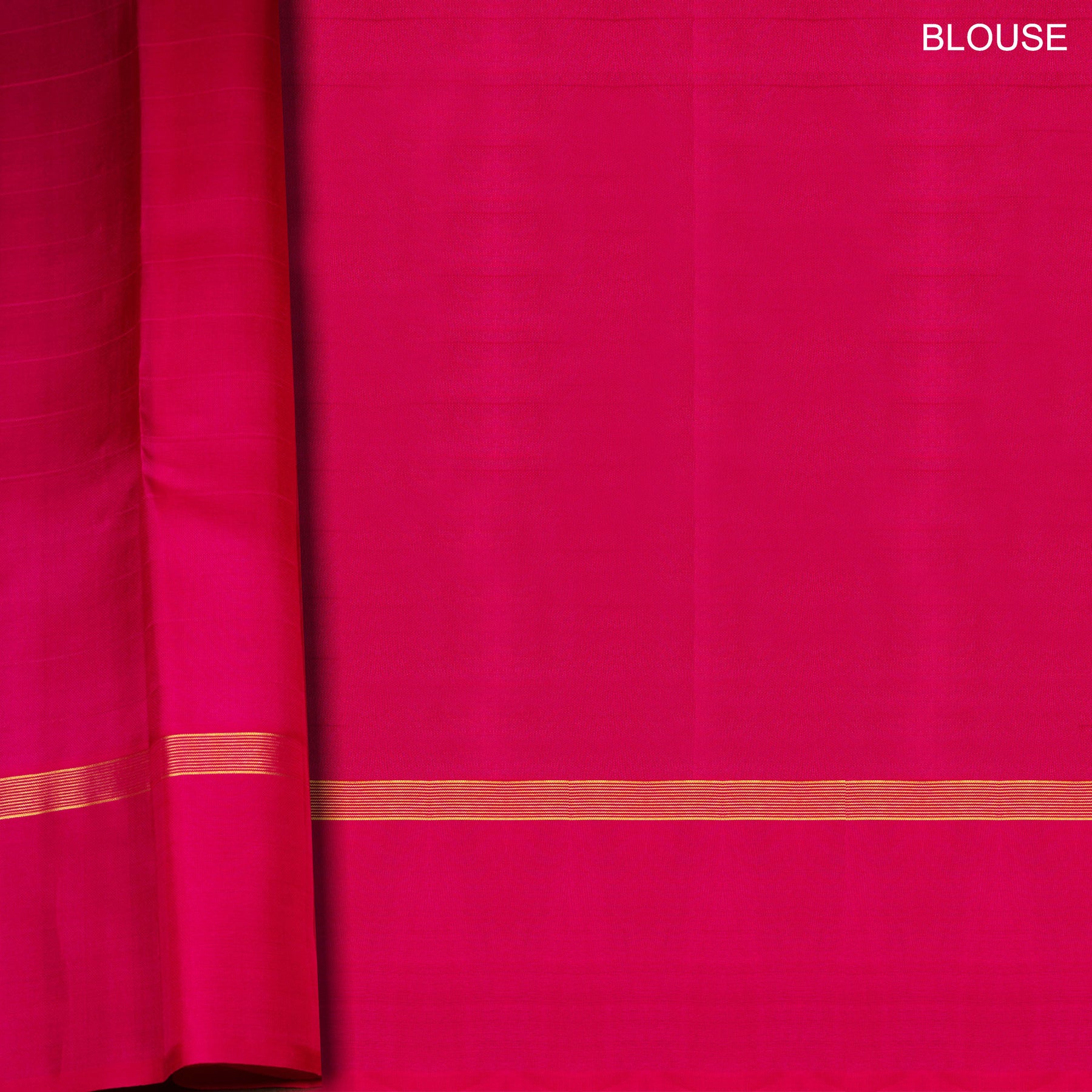 This stunning orange Kanjivaram silk saree features classic checks adorned with traditional chakram and mango butta motifs, creating a rich and vibrant look. The contrasting magenta border is detailed with elegant leaf butta, adding depth and traditional charm. The pallu is intricately woven with vaira mookuthi motif patterns, along with diamond and rudraksh stripe designs, offering a grand and artistic finish. Perfect for weddings and festive occasions, this saree reflects timeless South Indian craftsmanship. It comes with a plain magenta blouse paired with a running border.