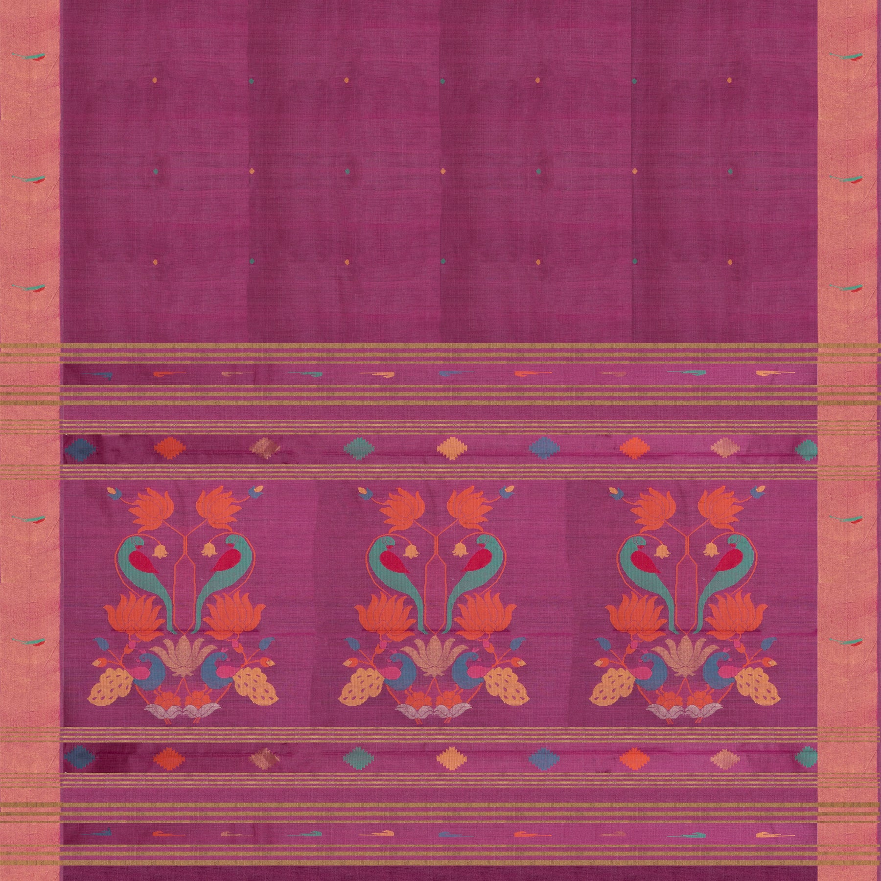 This elegant pink tussar silk saree features a subtle dotted pattern across the body, enhanced with a rich gold zari border inspired by traditional Paithani design. The pallu is beautifully crafted with multicolor jamdani work featuring intricate bird and floral motifs, adding a vibrant and artistic touch. Lightweight yet luxurious, this saree is perfect for festive occasions and ethnic wear. It comes with a plain blouse finished with a matching border for a complete look.