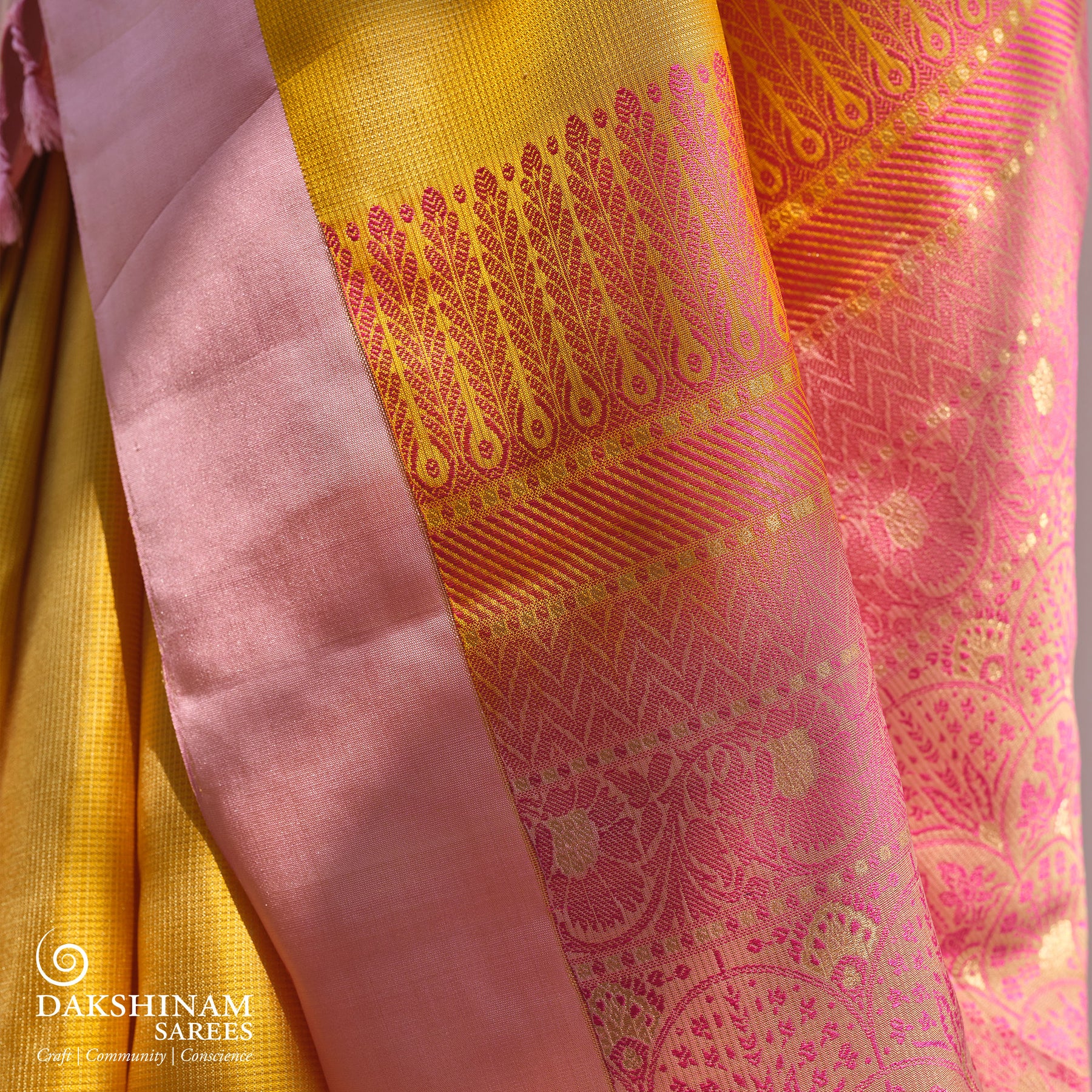 This elegant yellow soft silk saree features a self-textured body paired with a plain baby pink border for a soft contrast. The baby pink pallu is richly woven with floral vines, lotus, bavanchi, chevron, and floral motifs in deep pink and gold zari, creating a luxurious traditional look.Crafted in korvai technique, this lightweight saree is perfect for daily elegance, poojas, and special occasions. Comes with a plain light pink blouse, making it a graceful addition to the luxury soft silk saree collection. Approximate Length: Saree Length: 5.5 meters Blouse Length: 0.8 meters