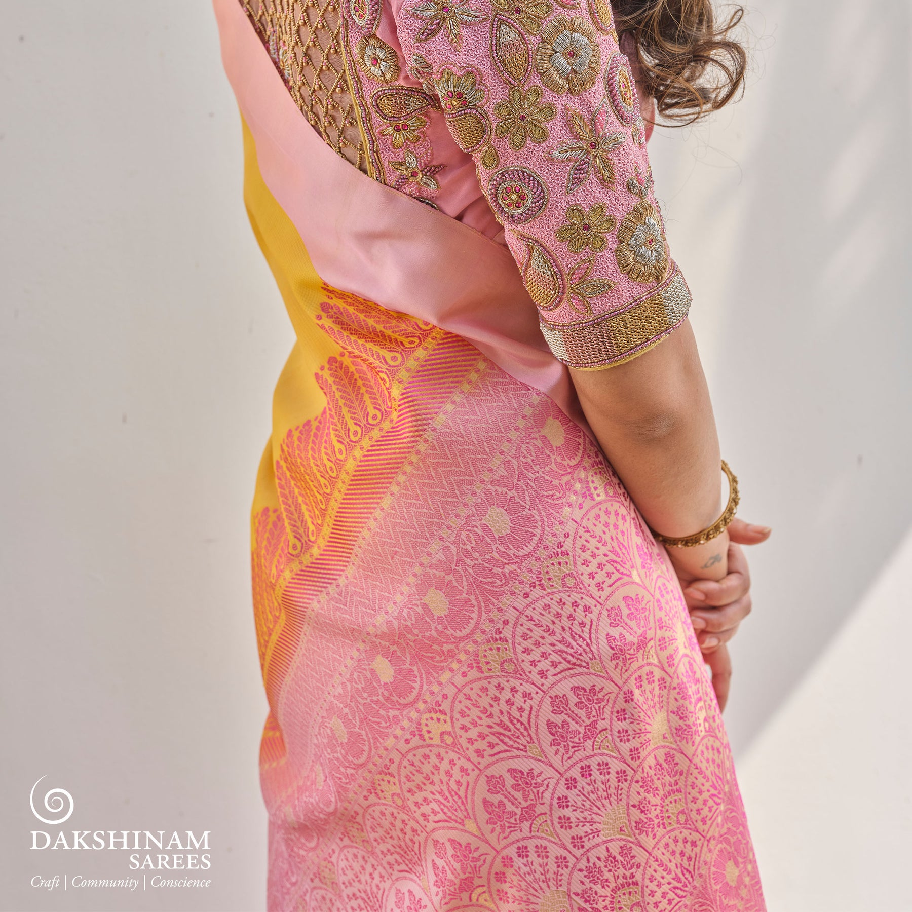 Tissue silks and heavy sarees should be dry cleaned to preserve their structure and flow. Store them flat or gently rolled, with muslin or acid-free tissue placed between folds to reduce friction and prevent color transfer. Handle them carefully while draping, using both hands, as they are more prone to tearing or distortion.