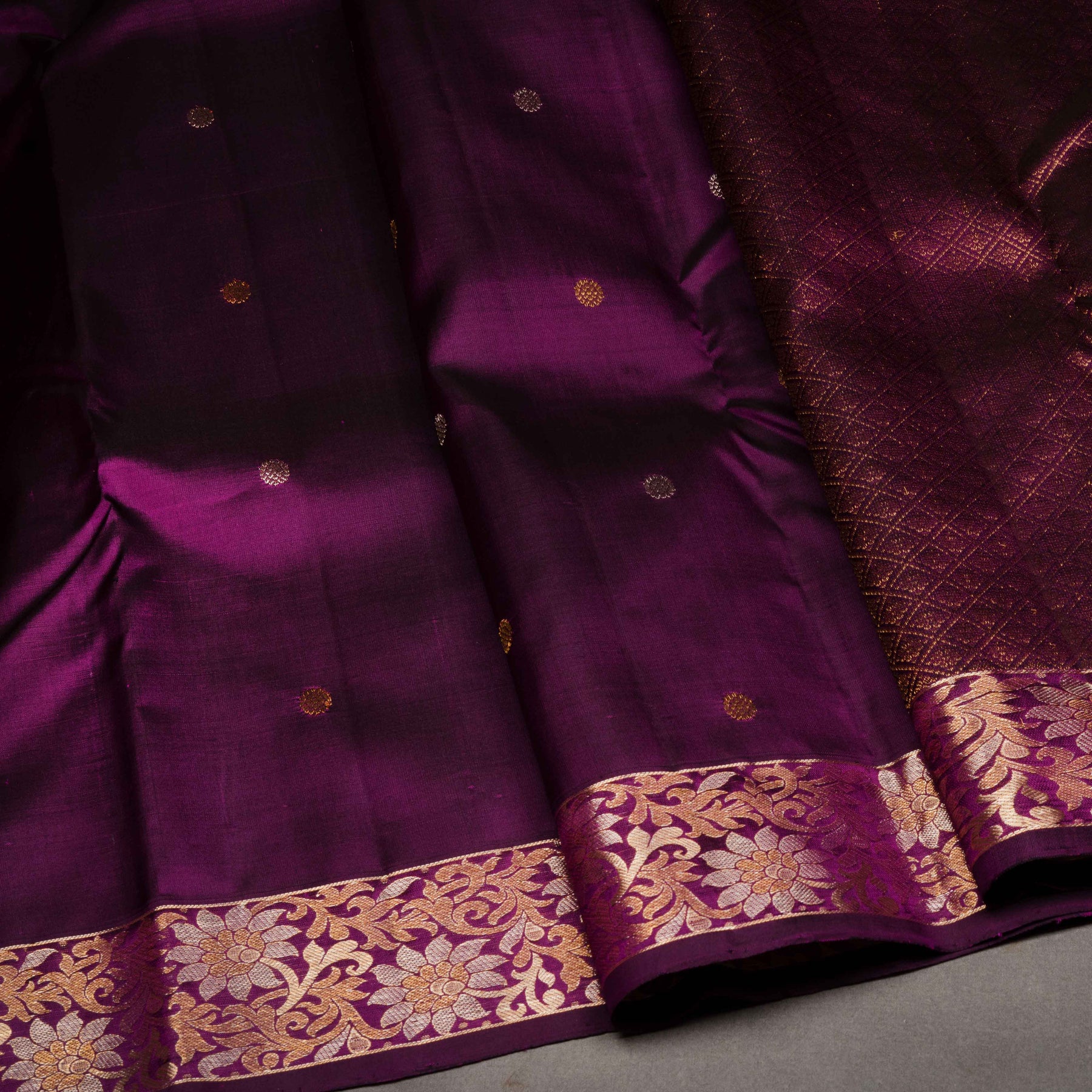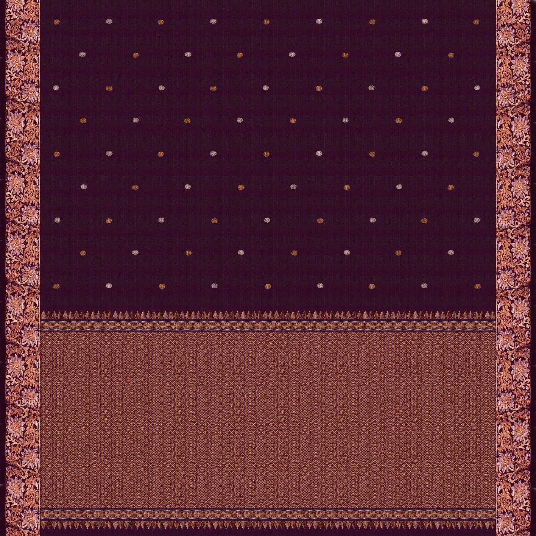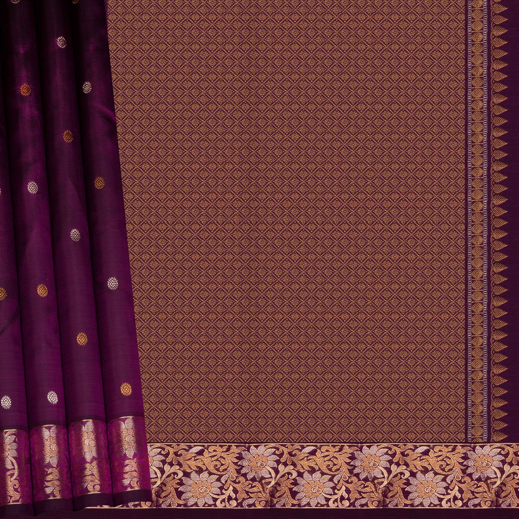 Indulge in the richness of heritage weaving with this exquisite monotone Kanjivaram silk saree in a regal purple shade. The body is adorned with delicate floral buttas crafted using gold and silver zari, lending it a graceful interplay of sheen and detail. The border features beautifully woven floral vines in dual-tone zari, adding depth and opulence while retaining refined elegance.
