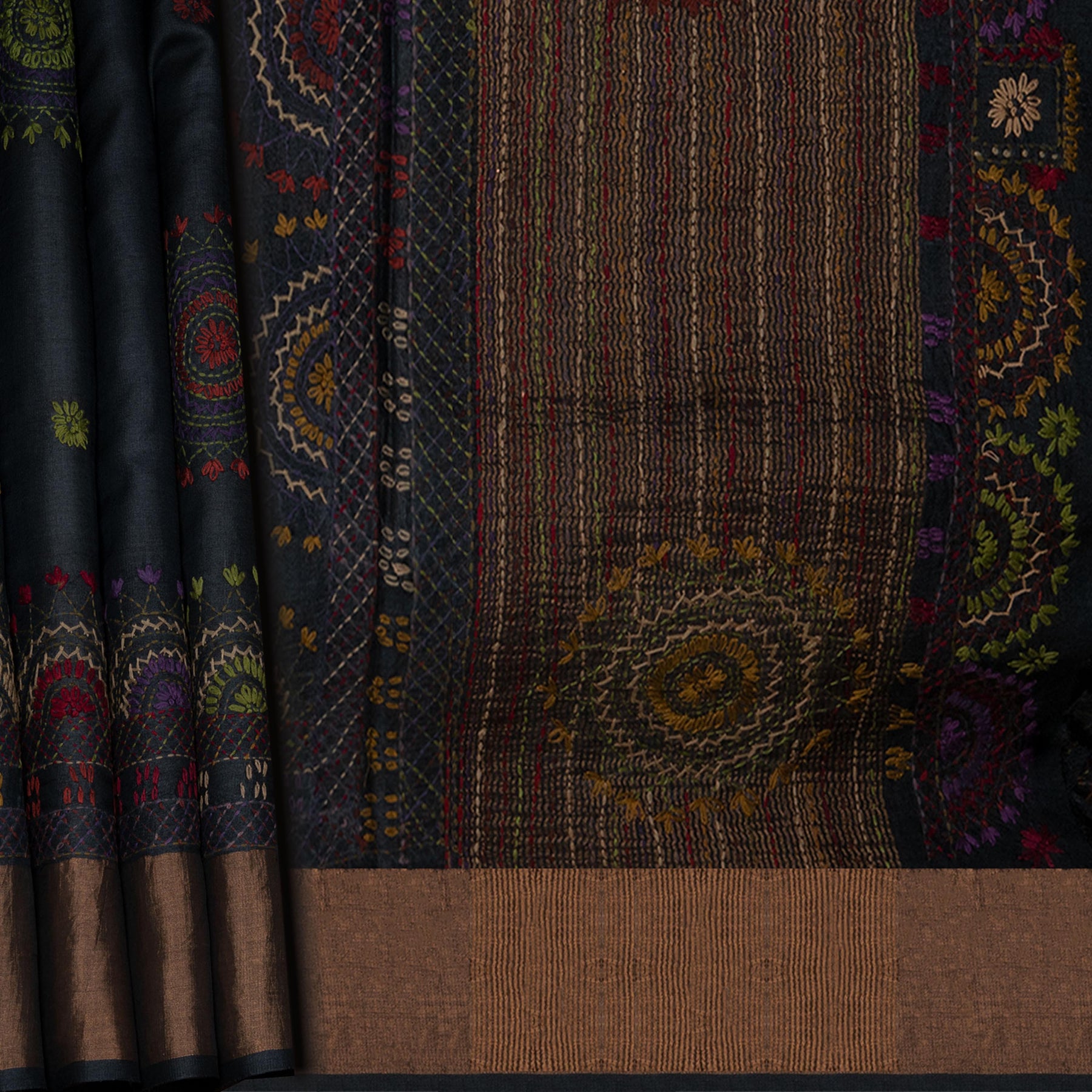 Elegant and timeless, this embroidered Tussar silk saree comes in a rich midnight blue hue, exuding understated sophistication. The body is adorned with intricate multicolour circular floral motifs, each carefully embroidered to reflect artisanal craftsmanship. The broad copper zari border enhances the drape with a luxurious sheen, while the pallu continues the artistry through detailed threadwork in hues of red, green, and purple, forming an exquisite blend of traditional and contemporary appeal. Woven from breathable pure Tussar silk, this saree combines elegance, comfort, and heritage — making it a graceful choice for festive celebrations or evening gatherings.