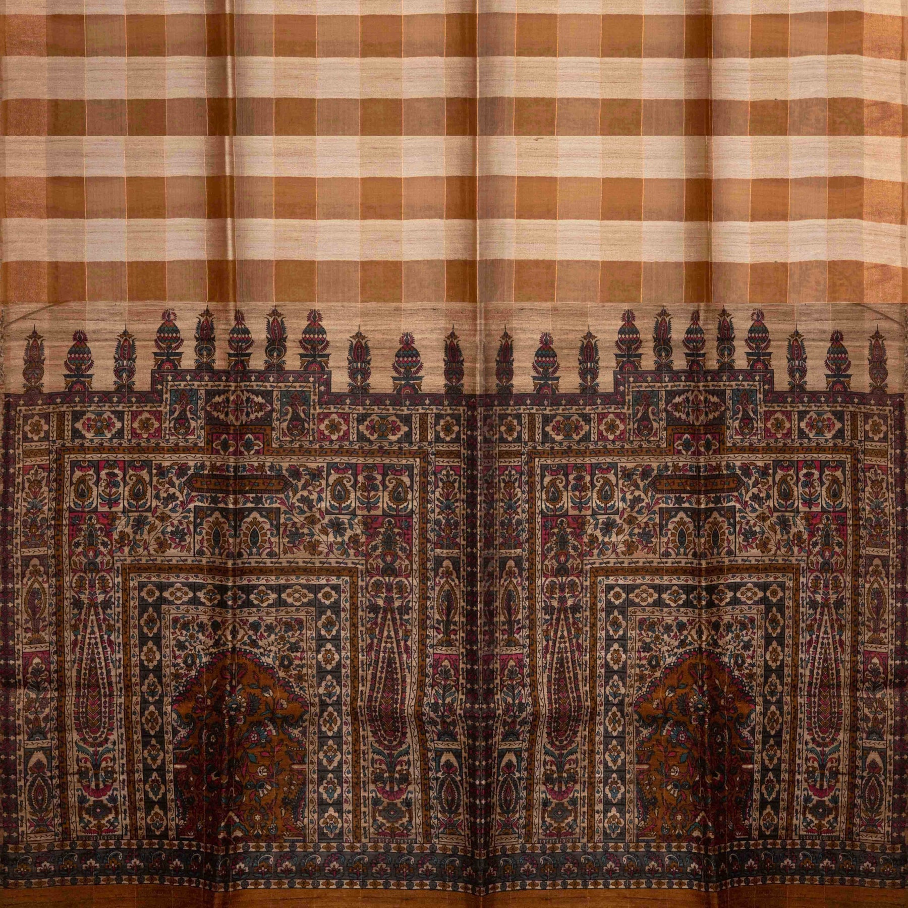 Textile with a checkered pattern and intricate border design.