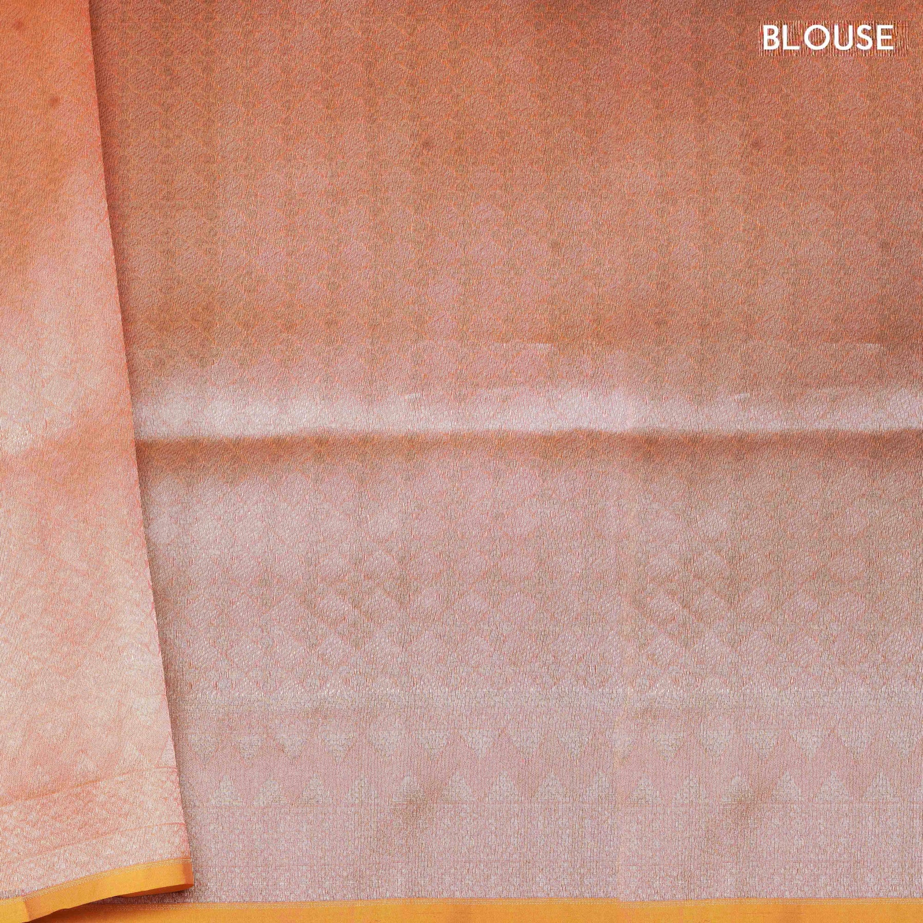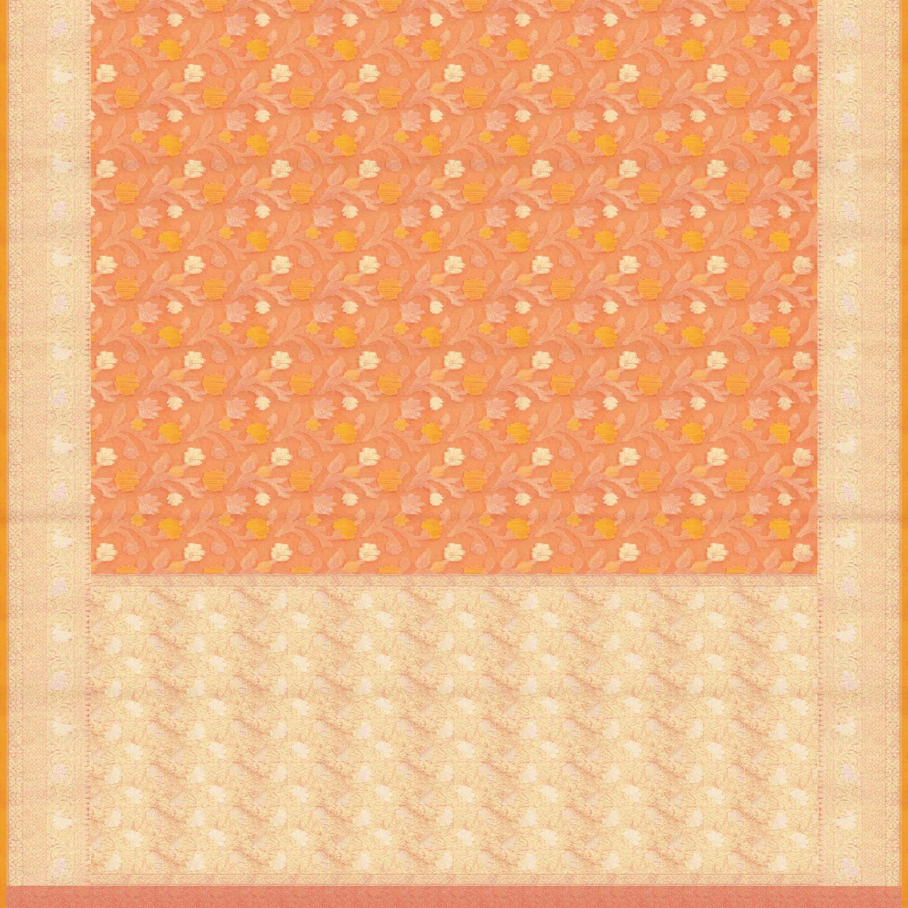 This elegant peach Kora silk saree is adorned with delicate floral vine patterns in shimmering gold, silver zari, and subtle yellow accents, adding a rich texture to the soft fabric. The monotone border features an exquisite mix of floral vines, temple motifs, diamond checks, and intricate floral designs that enhance the saree's regal appeal. The pallu is beautifully decorated with floral patterns in gold and silver zari, complemented by chevron and stripe details for a harmonious finish. The blouse showcases a matching diamond and floral pattern with triangles towards the border, perfectly completing this traditional yet contemporary ensemble.