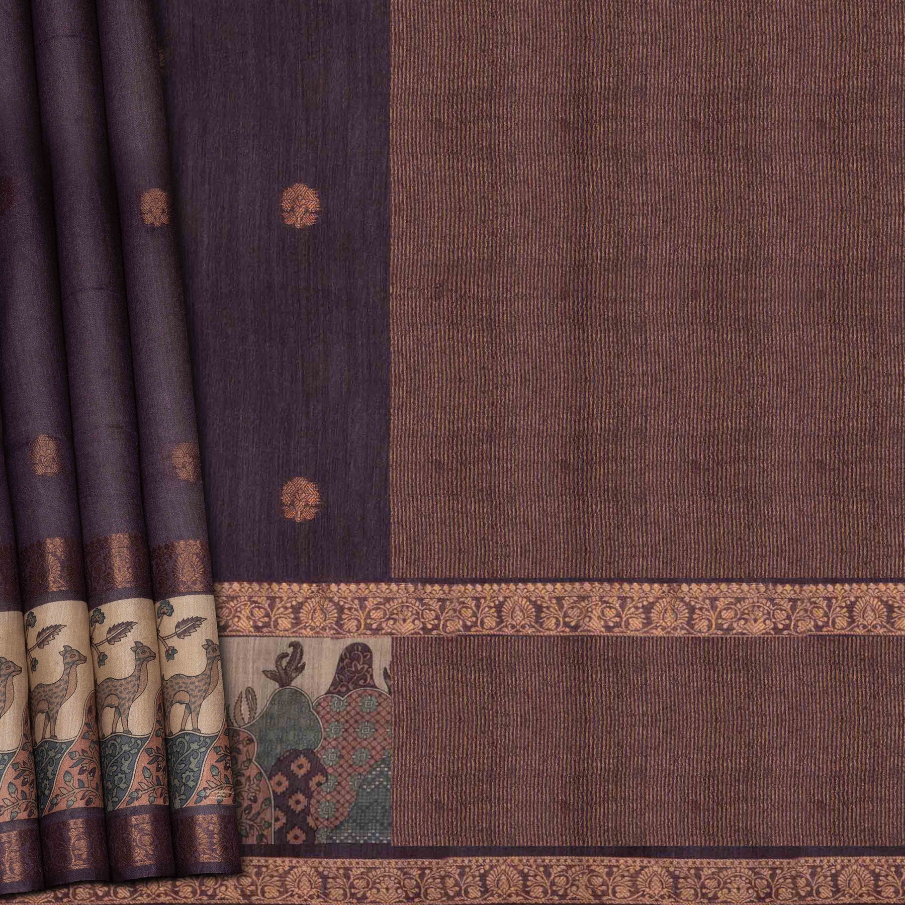 Embrace the charm of artistry with this elegant Tussar silk saree in a soothing purple mauve shade. The body is adorned with delicate floral buttas that add subtle grace, while the offwhite border features a captivating abstract print of mountains, deer, and floral vines, all highlighted with copper zari on both ends. The mauve pallu complements the design with fine stripes of zari, enhancing its traditional appeal. Crafted from breathable pure Tussar silk, this saree blends comfort with sophistication, making it ideal for festive occasions and modern office wear. The beige blouse with leaf vine patterns perfectly completes the ensemble.