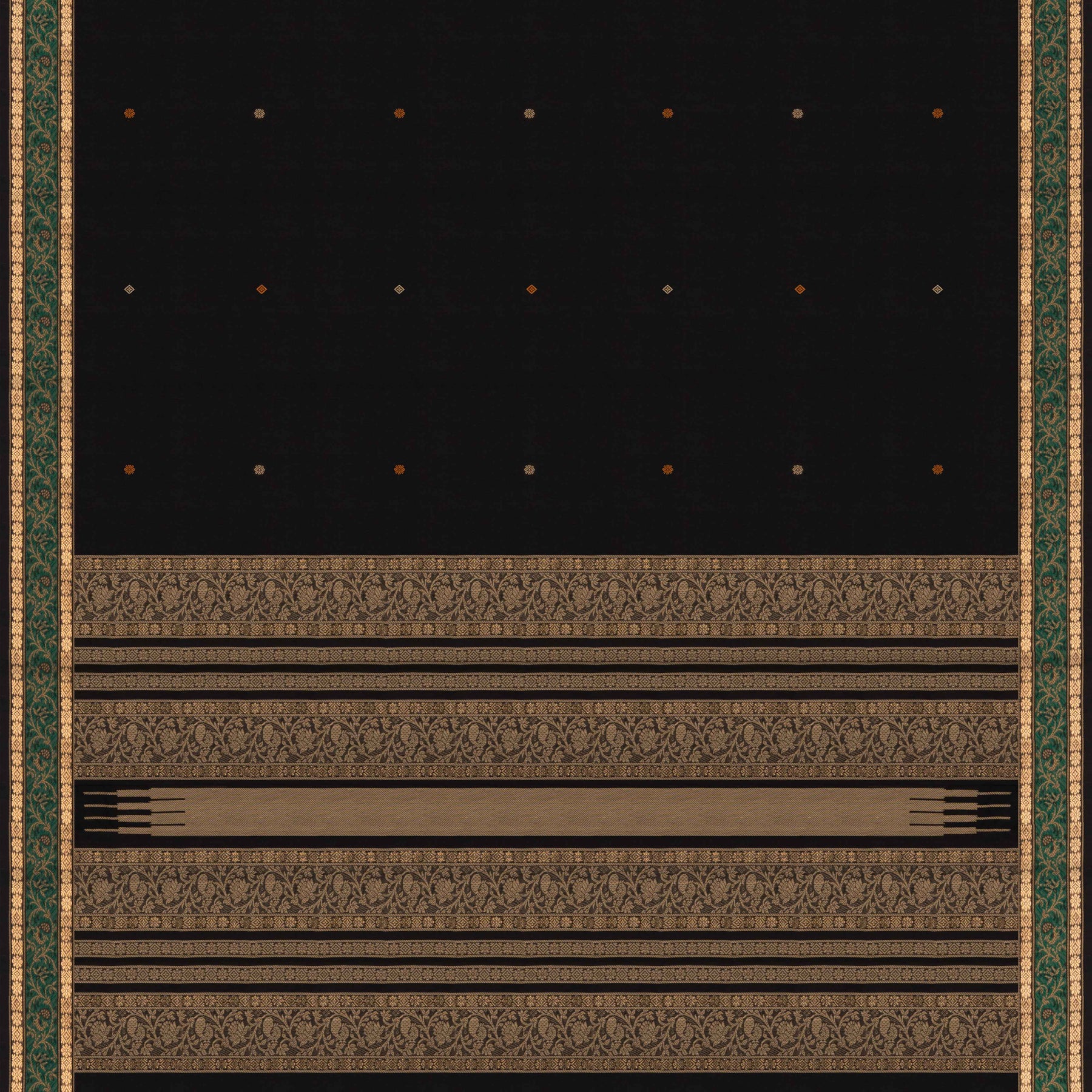 This elegant black Kanchi cotton saree features diamond dotted butta motifs across the body for a classic traditional look. The border showcases chakram and diamond butta forming a decorative band with green floral thread work, while the pallu is richly designed with temple, chakram, diamond, and floral motifs.