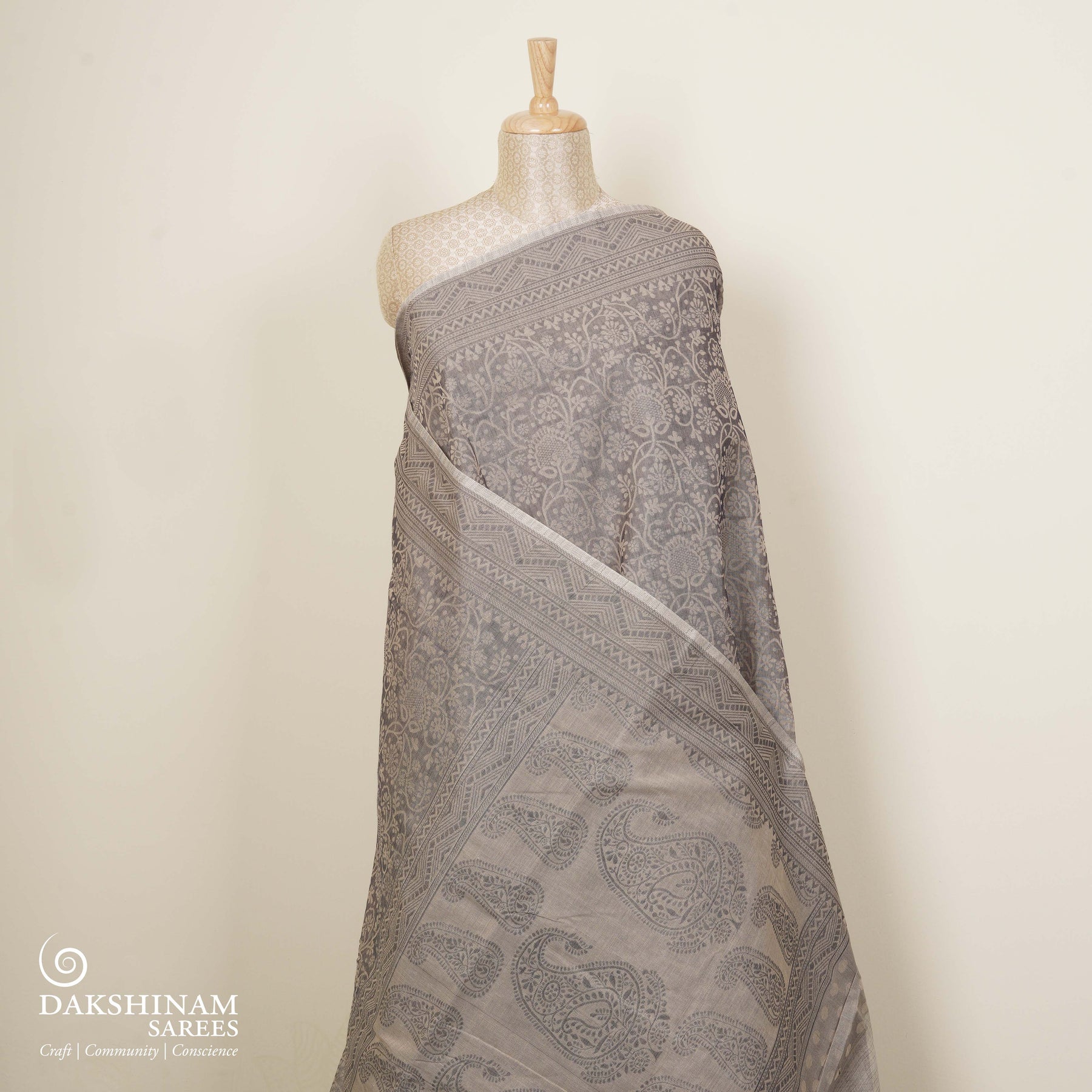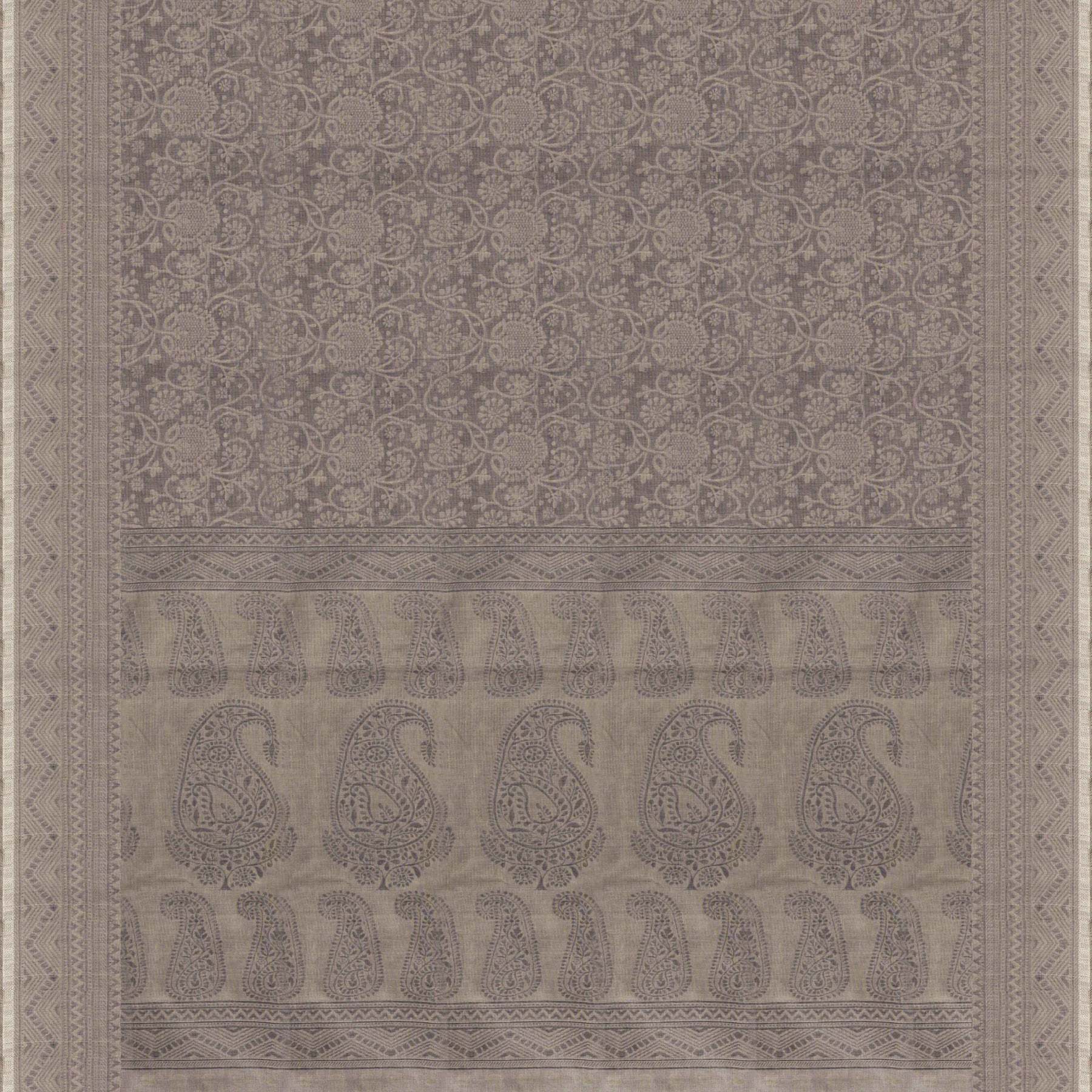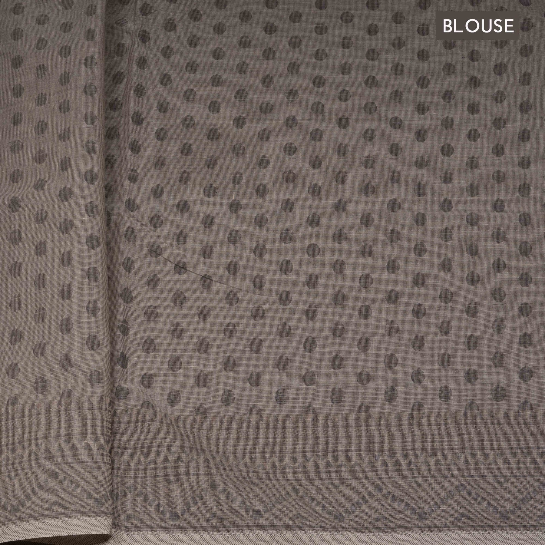 Graceful and versatile, this South cotton saree in soft beige features a delicate floral vine pattern across the body. The border is adorned with traditional chevron lines, dotted lines, diagonal detailing, vanki motifs, and inverted triangle elements. The pallu continues the heritage design with continuous mango and paisley motifs for a cohesive traditional finish. Paired with a matching blouse featuring dot design and a continuous border, this saree is ideal for everyday elegance and cultural occasions.