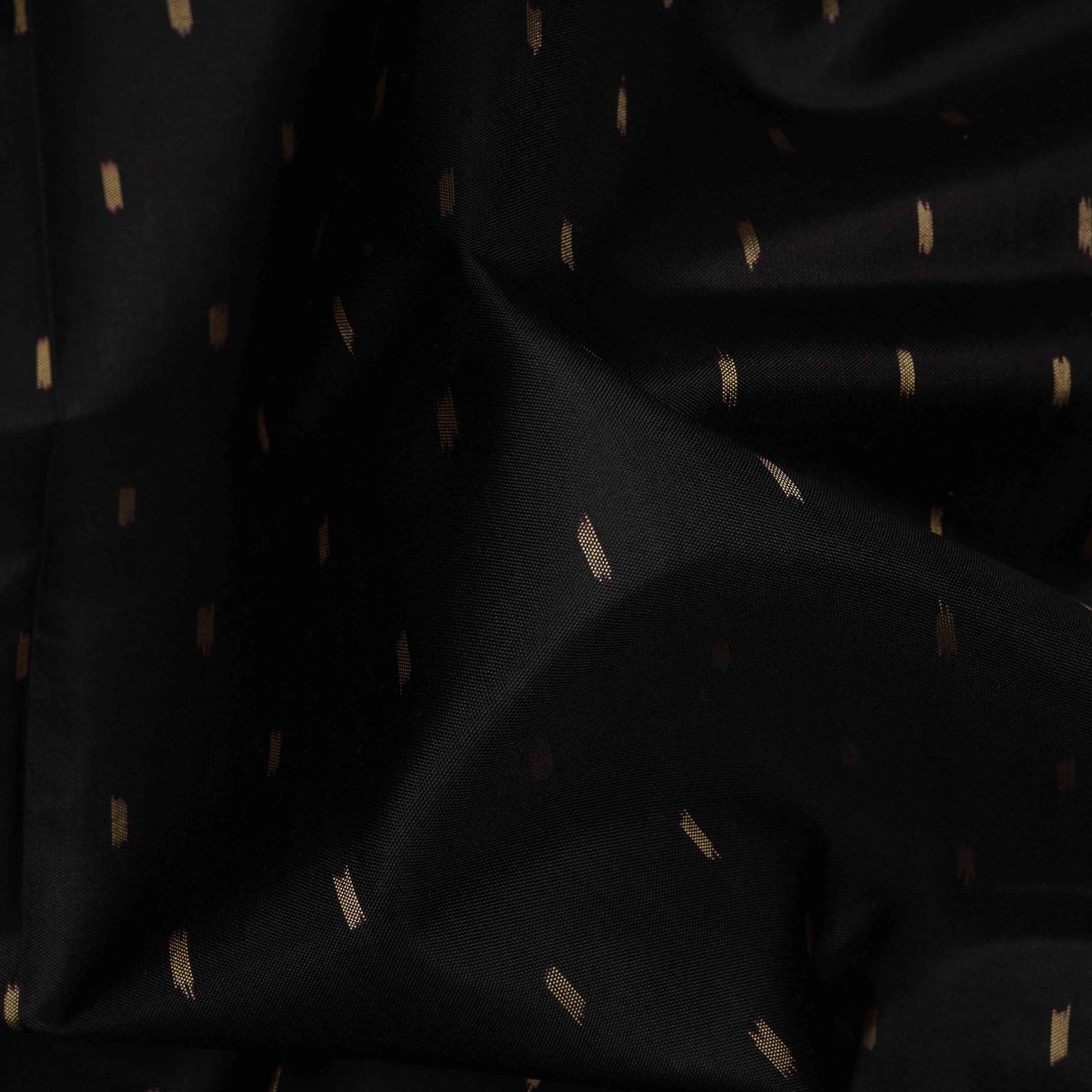 Timeless and regal, this black Rajkot Ikat silk saree is a true celebration of traditional craftsmanship. The body features delicate dash motifs, creating a refined texture against the deep black silk base. The borders are adorned with a rich gold tissue band, embellished with intricate floral vines and classic stripes, bringing elegance and contrast to the design. The pallu continues the opulence with detailed stripes, paisley motifs, and floral vine patterns—expertly woven to highlight the finesse of Ikat artistry. Paired with a plain blouse in matching silk, this saree is a perfect pick for festive occasions, weddings, or evening events.