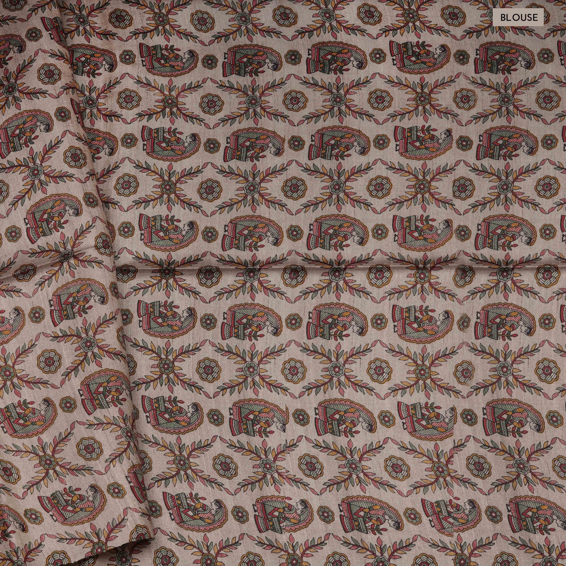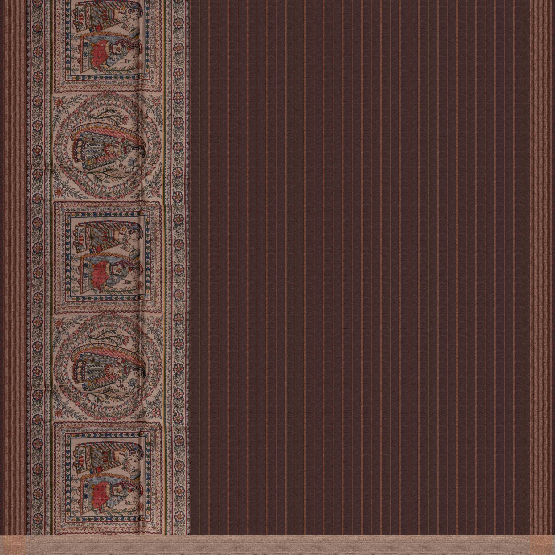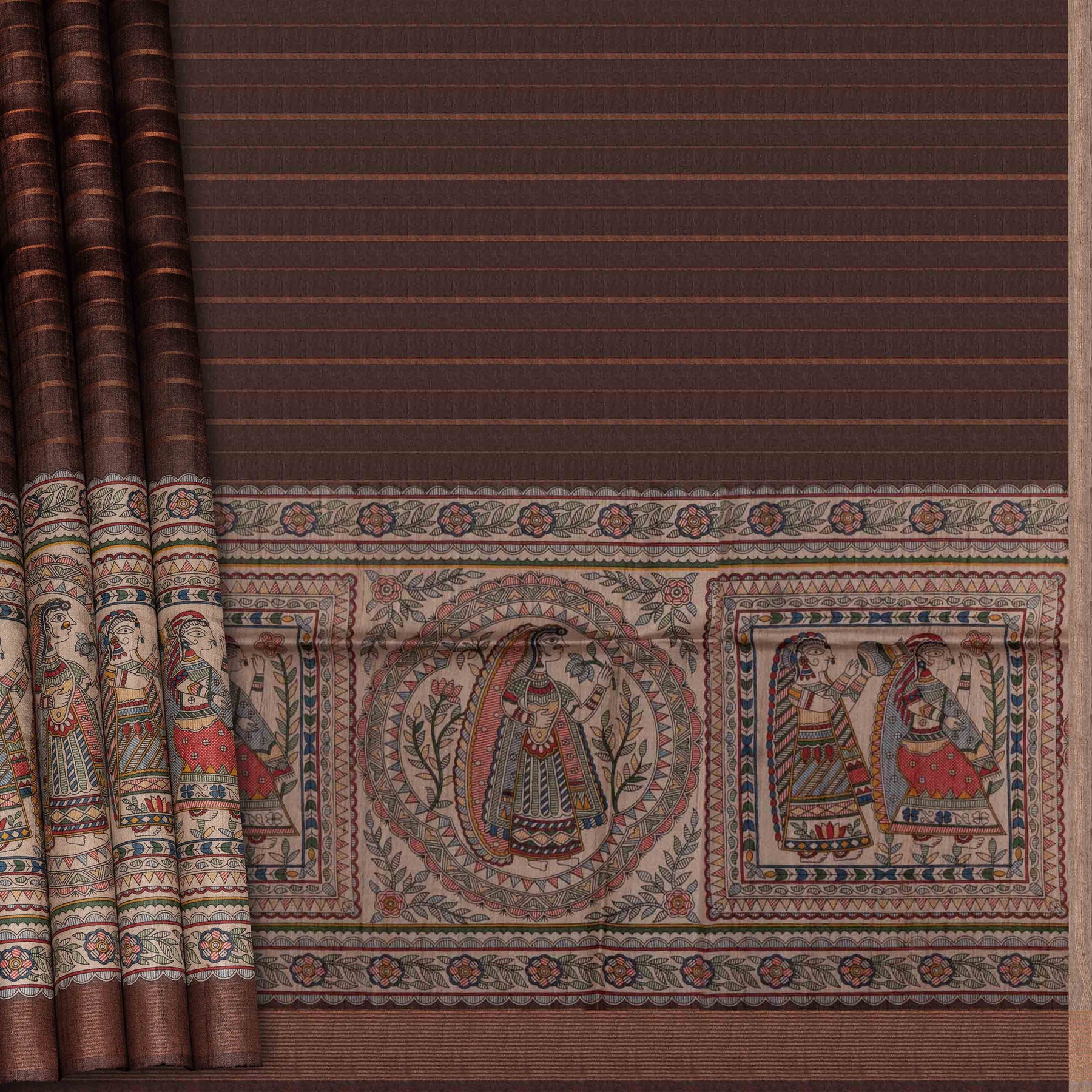 Discover understated elegance with this printed Tussar silk saree featuring a warm brown body accented with subtle stripes. The offwhite border beautifully showcases intricate Madhubani women figurative patterns interwoven with florals and leaves, adding an artistic touch. The brown pallu is complemented by a delicate offwhite band along the edge, creating a harmonious balance of colors and motifs. The breathable pure Tussar silk fabric offers lightweight comfort, making it ideal for office wear, festive occasions, and modern ethnic styling. The blouse in offwhite mirrors the Madhubani figurative print, completing this sophisticated ensemble.