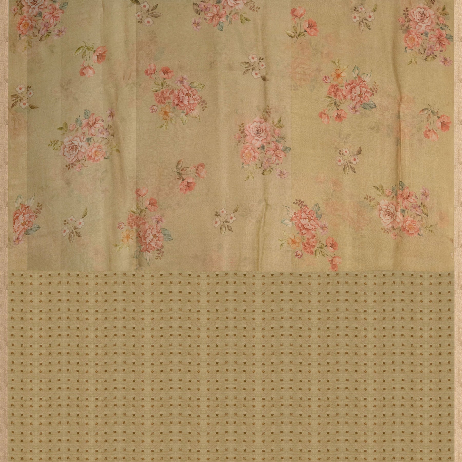 Delicate and dreamy, this cardamom green Matka Organza silk saree is a refreshing take on minimal elegance, ideal for wedding guests and bridesmaids. The lightweight organza body features a soft floral print that adds a touch of romance to the pastel-toned drape. A monotone gold tissue border frames the saree beautifully, while the pallu is subtly embellished with woven sequins, offering a refined sparkle. It comes with a plain Matka silk blouse detailed with a woven sequin border, completing the ensemble with quiet luxury.
