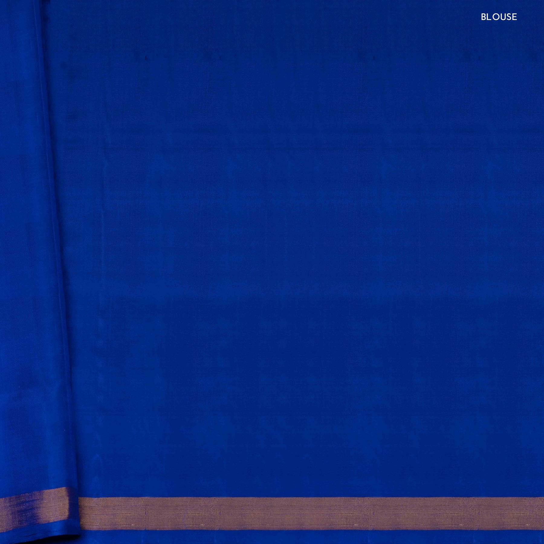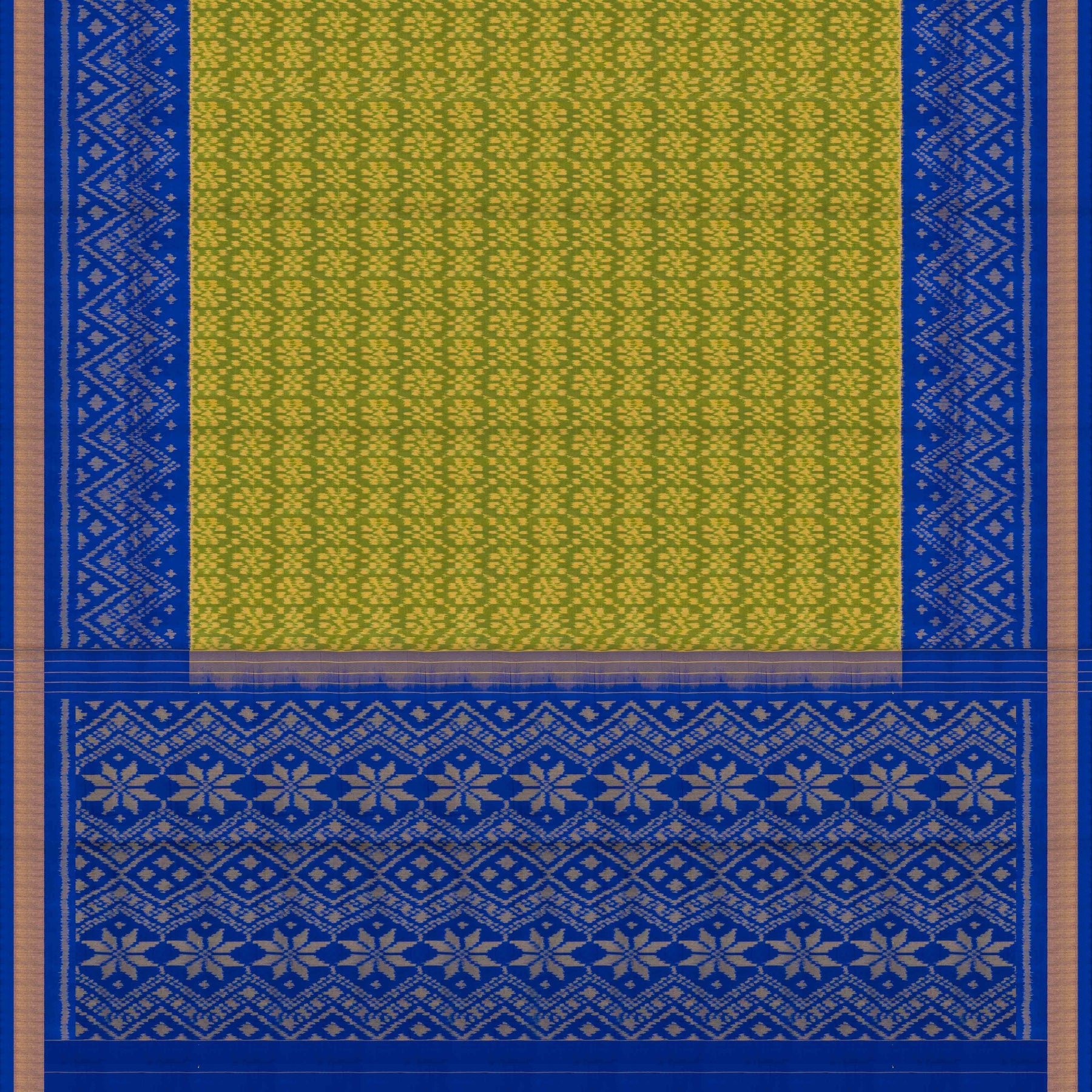 Experience the elegance of tradition with this Rajkot Ikat silk saree in a soothing light green shade. The body is adorned with delicate yellow floral motifs that bring a subtle charm to the fabric. Contrasting beautifully, the royal blue border features intricate zigzag patterns, stripes, and a luxurious tissue zari finish, while the royal blue pallu continues the theme with floral and zigzag designs interspersed with stripes. Crafted using the intricate Ikat technique, this saree combines breathable silk comfort with exquisite handwoven artistry. The matching royal blue blouse is accented with a tissue zari border, completing this sophisticated look, perfect for poojas, functions, or office-friendly ethnic wear.