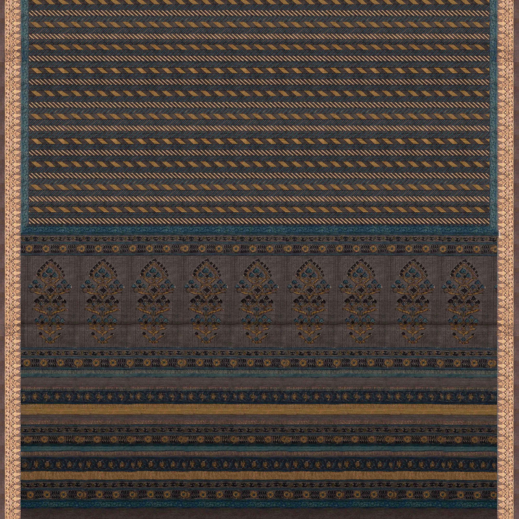 Add understated elegance to your collection with this refined Moonga Tussar silk saree in a serene grey tone. The body features multicolour geometric chevron patterns that lend a contemporary touch, while the border is enriched with leaf motifs, delicate floral vines, and stripes highlighted in subtle copper zari. The pallu stands out with a graceful Tree of Life design paired with fine stripes, reflecting the beauty of handcrafted detailing. Lightweight yet rich in texture, this saree is perfect for festive gatherings, cultural events, and elegant daytime occasions.