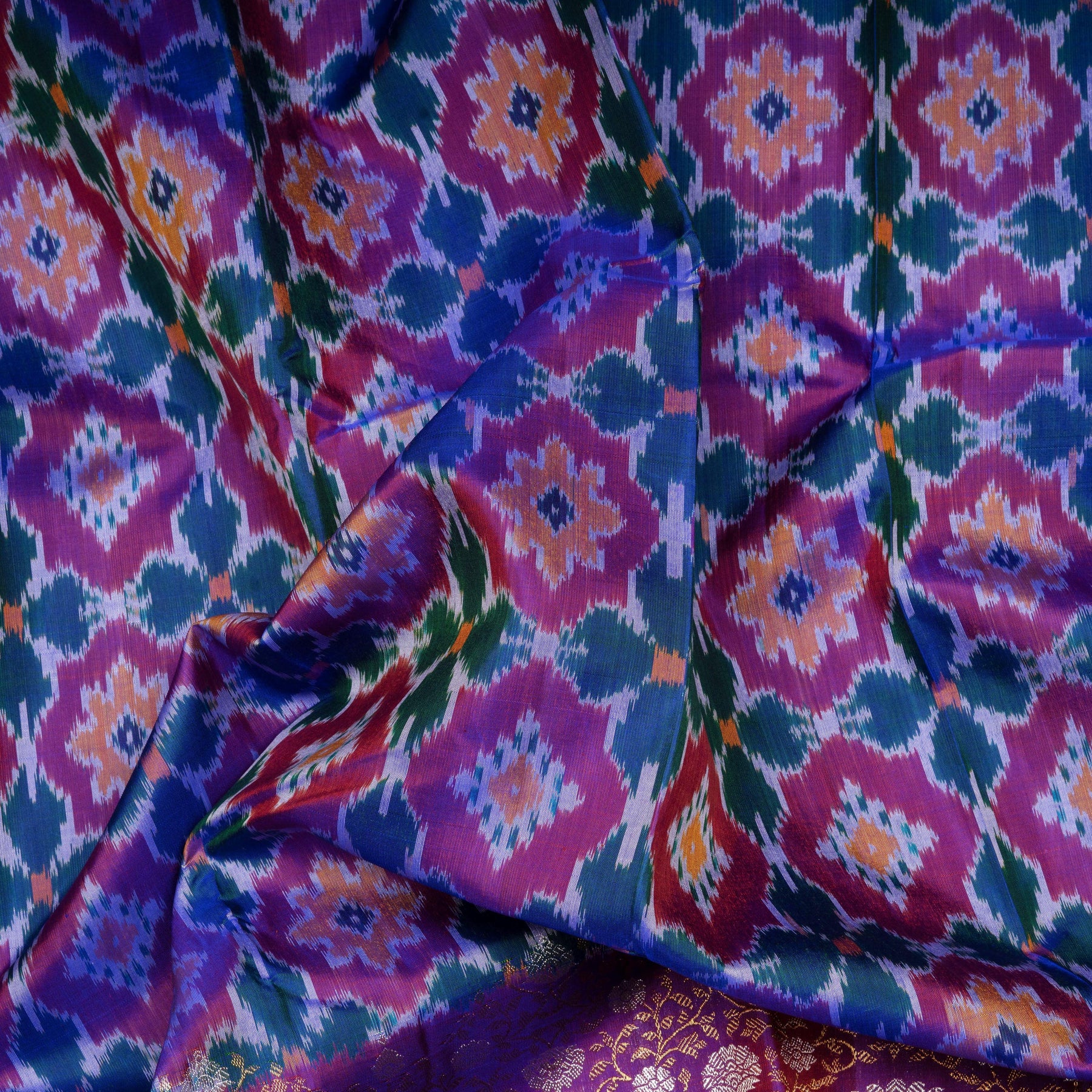Embrace vibrant craftsmanship with this exquisite double Ikat Kanjivaram silk saree, where tradition meets striking artistry. The multicolor body is beautifully woven with geometric floral Ikat patterns, creating a rich visual rhythm that reflects timeless South Indian heritage. The regal purple border is intricately adorned with floral vines and blooming plant motifs in a harmonious blend of gold and silver zari, adding depth and grandeur. Completing the saree is a detailed purple pallu featuring diamond-shaped patterns highlighted with rudraksha, florals, leaf forms, paisleys, and echoes of the floral border design, lending it a majestic finish. Crafted from pure Kanjivaram silk, this saree is ideal for weddings, festive celebrations, and special occasions where elegance takes center stage. The purple blouse with a matching border perfectly complements the saree, completing this luxurious ensemble.