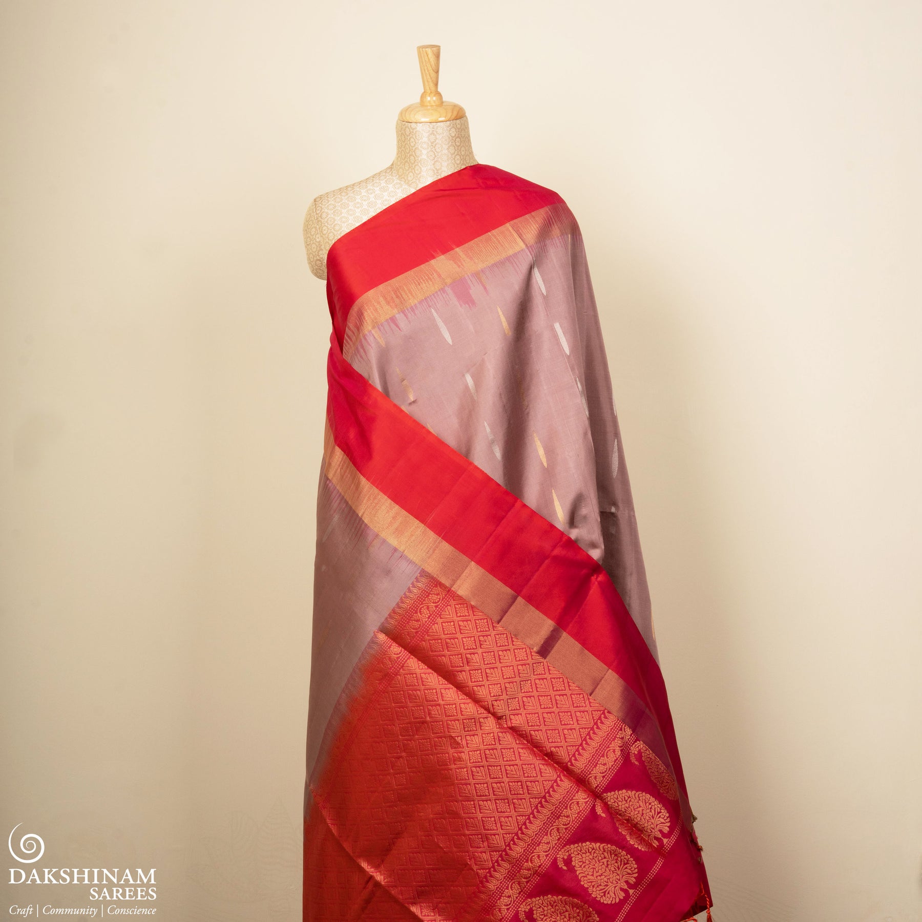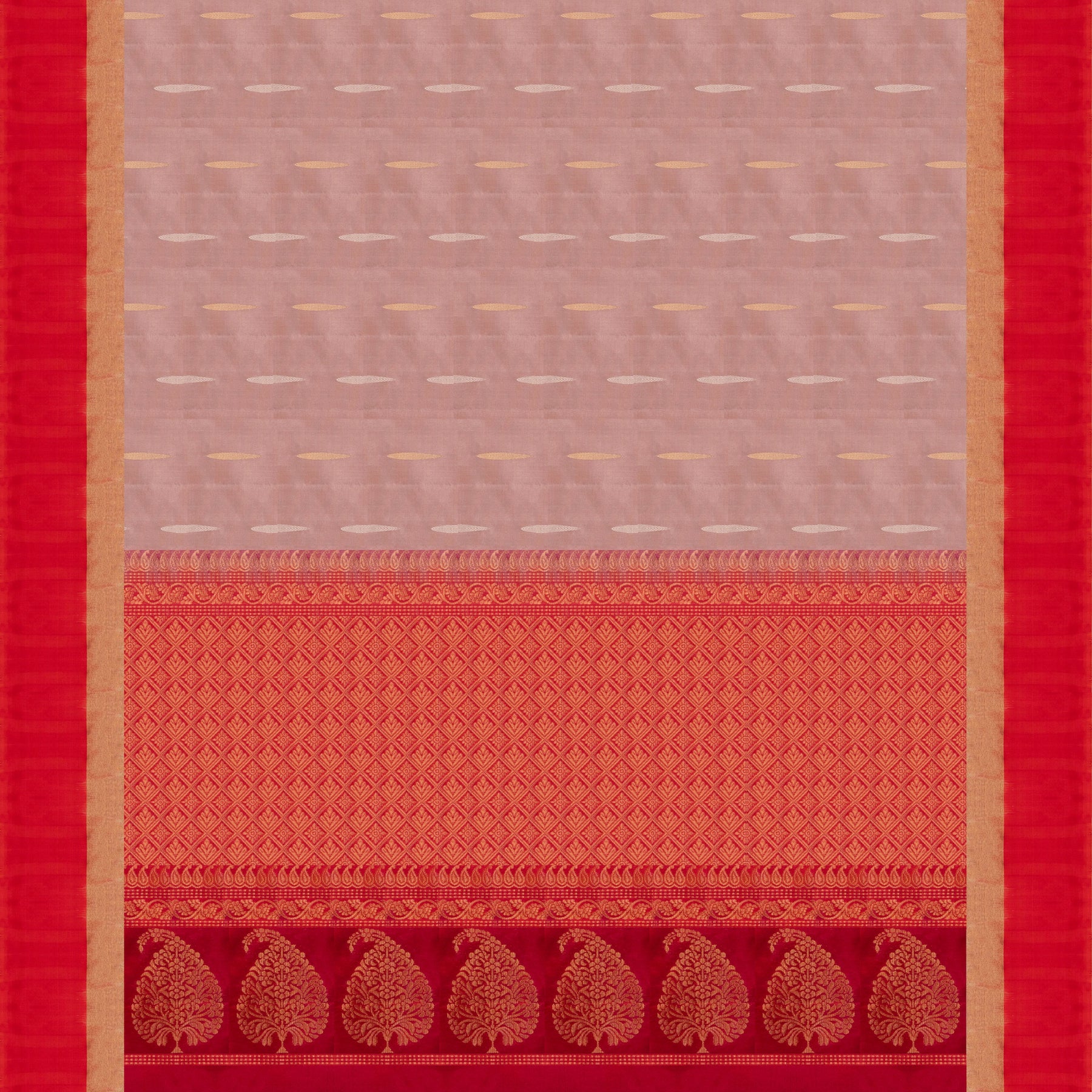 Discover understated elegance with this refined soft silk saree in a soothing dusty lavender hue. The body is beautifully adorned with tilak-inspired leaf buttas woven in a subtle blend of gold and silver zari, lending a gentle shimmer to the fabric. A plain contrast red border frames the saree gracefully, while the rich red pallu is detailed with diamond checks, floral and leaf motifs, complemented by intricate floral vines, paisleys, and a symbolic tree-of-life design shaped in paisley form. Lightweight and fluid, this soft silk saree is ideal for festive gatherings, cultural occasions, and elegant everyday wear.