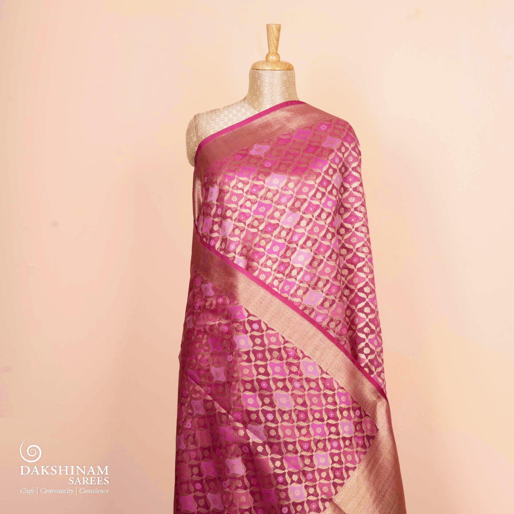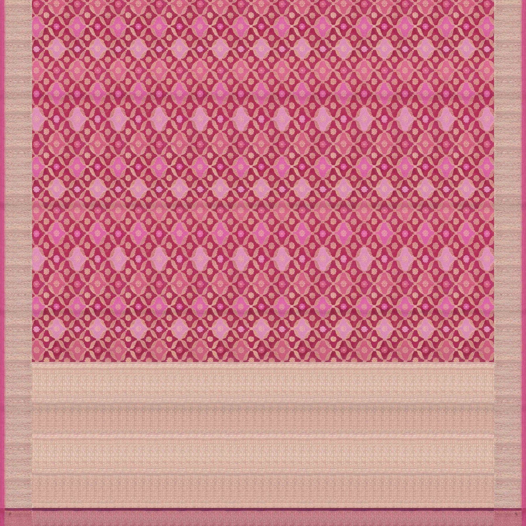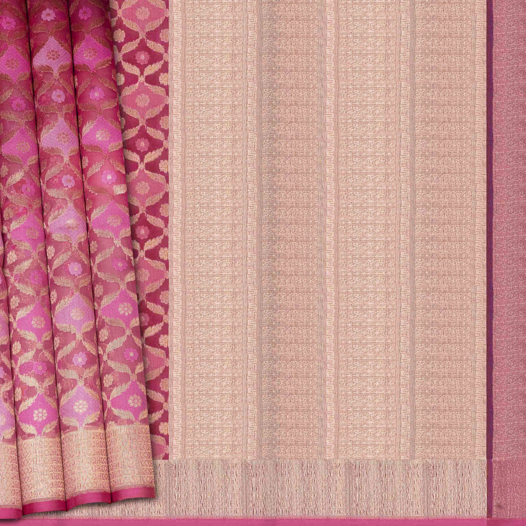 Embrace delicate elegance with this light pink Kora silk saree showcasing beautiful leaf motifs forming oval-shaped patterns filled with intricate florals. The weave alternates between lavender and pink meenakari designs alongside classic Kora silk floral patterns, creating a subtle yet sophisticated texture. The monotone border features a striking diamond-shaped pattern, mirrored gracefully on the pallu for a cohesive look. Finished with a plain blouse, this saree is perfect for festive celebrations and traditional occasions.