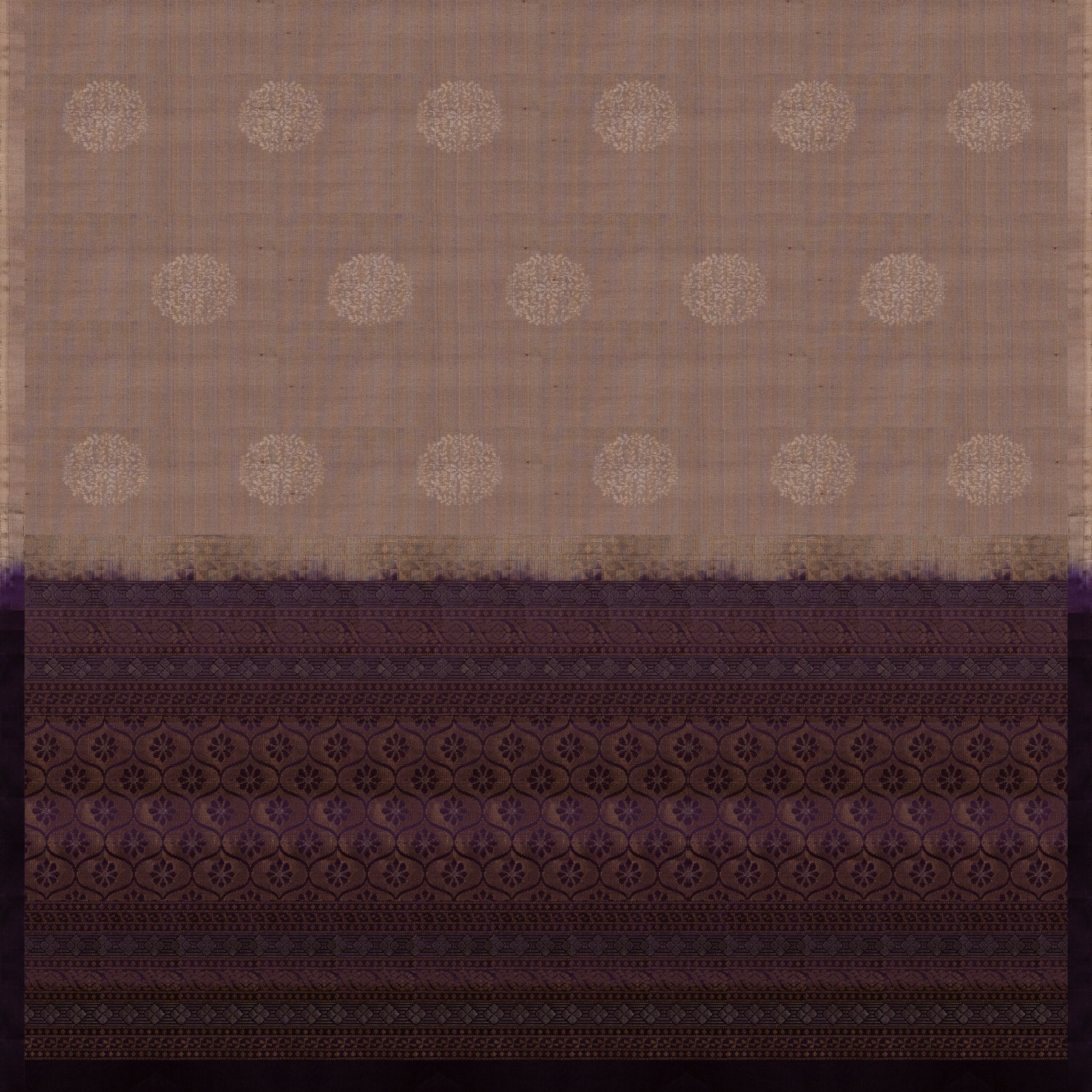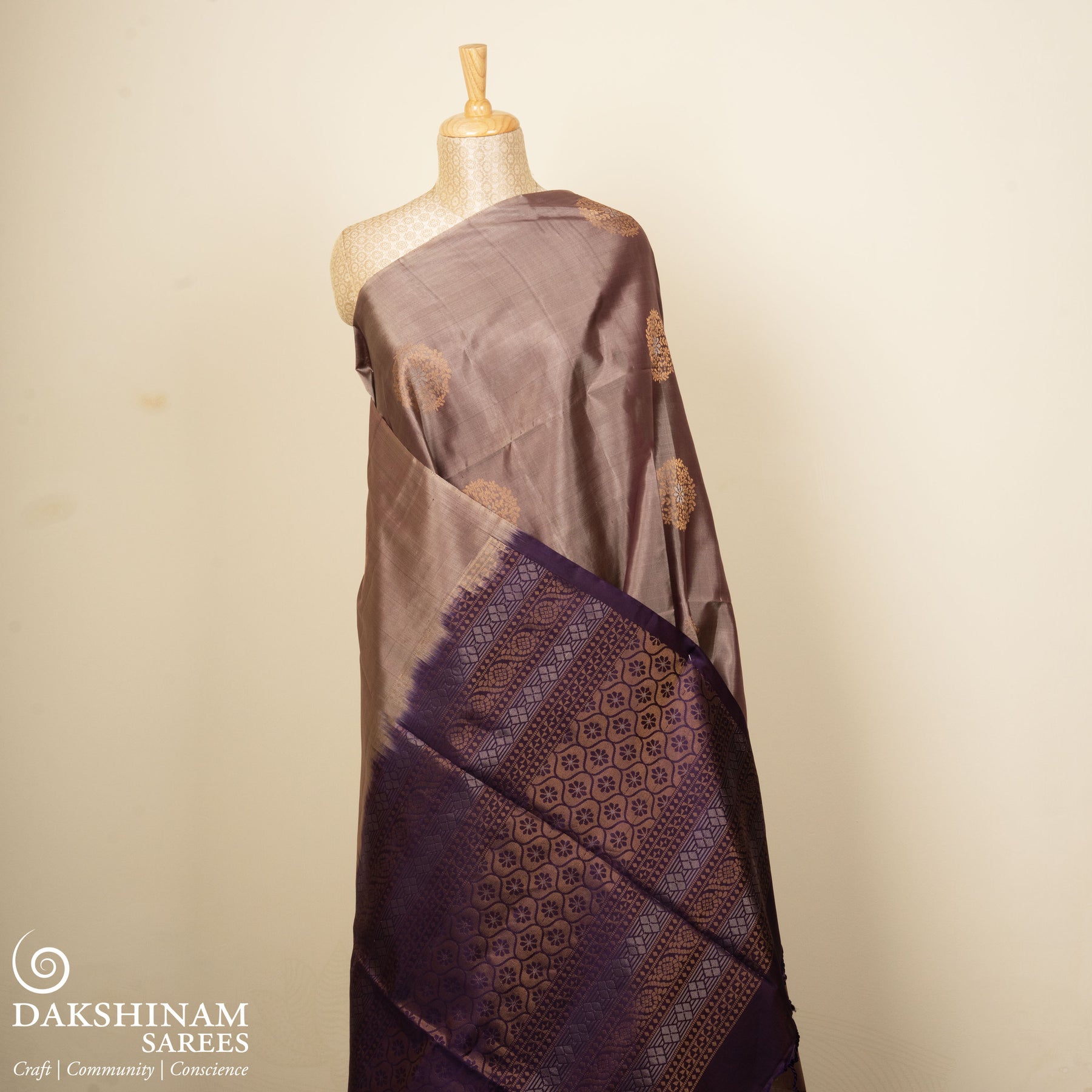 Graceful and refined, this soft silk saree comes in a soothing mauve-grey body adorned with delicate round floral buttas woven in a harmonious blend of gold and silver zari. The deep purple pallu adds a striking contrast, featuring an intricate play of diamonds, stripes, floral and geometric motifs, along with jharokha-inspired patterns highlighted in rich dual-tone zari. Lightweight and fluid in drape, this soft silk saree is perfect for festive gatherings, intimate celebrations, and elegant day occasions.