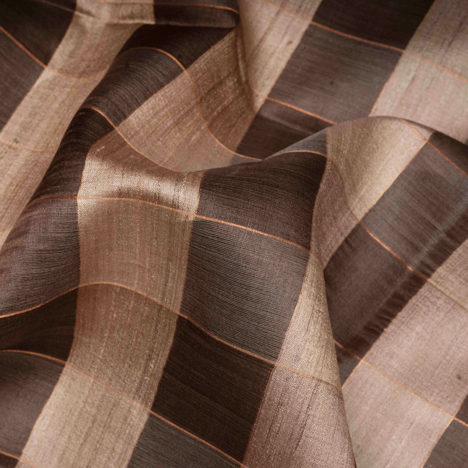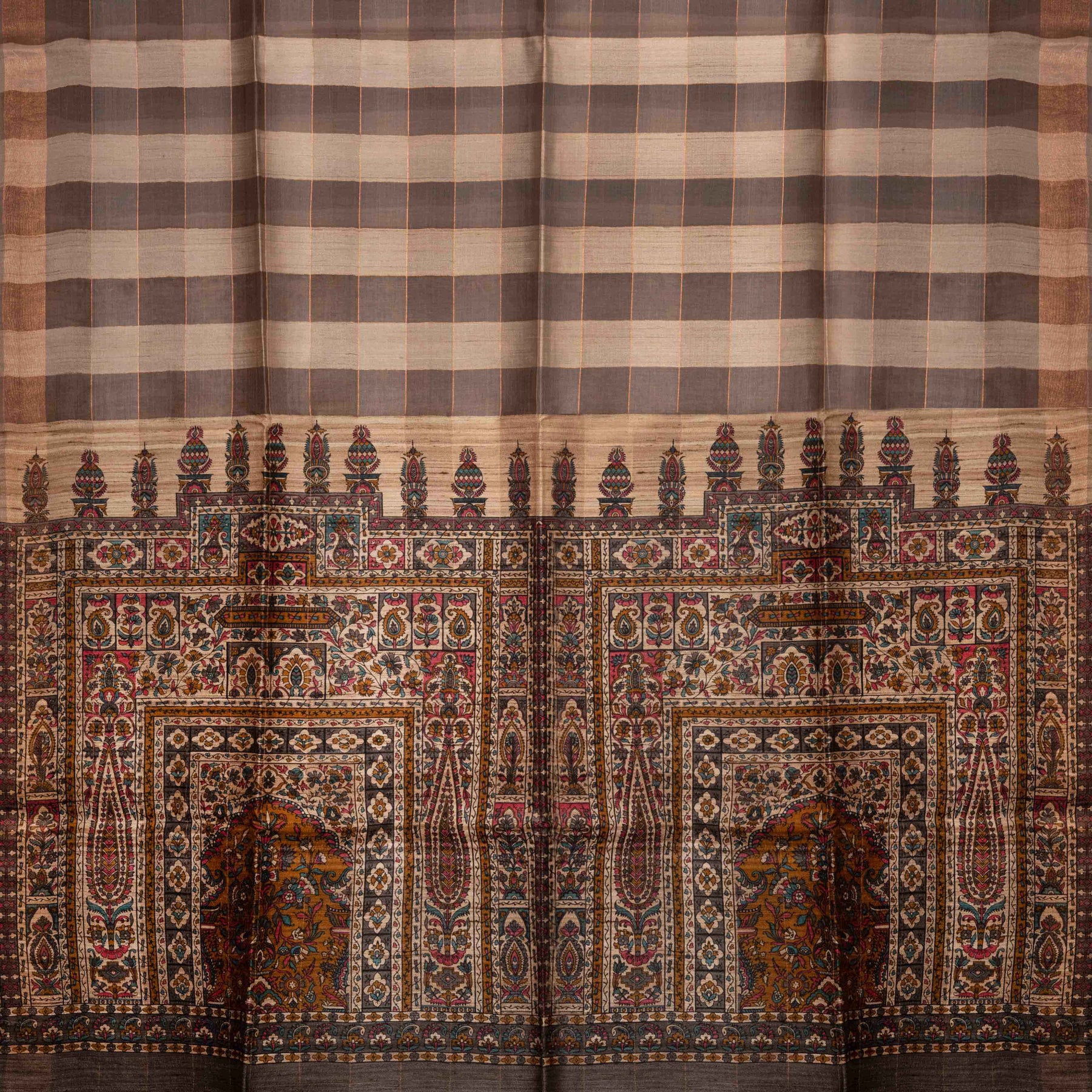 Elegantly blending tradition with modern aesthetics, this printed Kora Tussar silk saree features a beautiful beige and grey body crafted with bands of grey Kora silk and beige Tussar silk, highlighted by fine gold zari lines forming a delicate checkered pattern. The gold tissue border adds a rich touch of luxury, while the grey pallu is adorned with exquisite floral, jharokha, paisley, and Mughal-inspired leaf motifs, creating an artistic and regal appeal. The breathable pure Tussar silk fabric ensures comfort and sophistication, making it a perfect choice for festive occasions, office wear, or elegant gatherings. The matching grey blouse features floral vine patterns, completing this graceful ensemble.