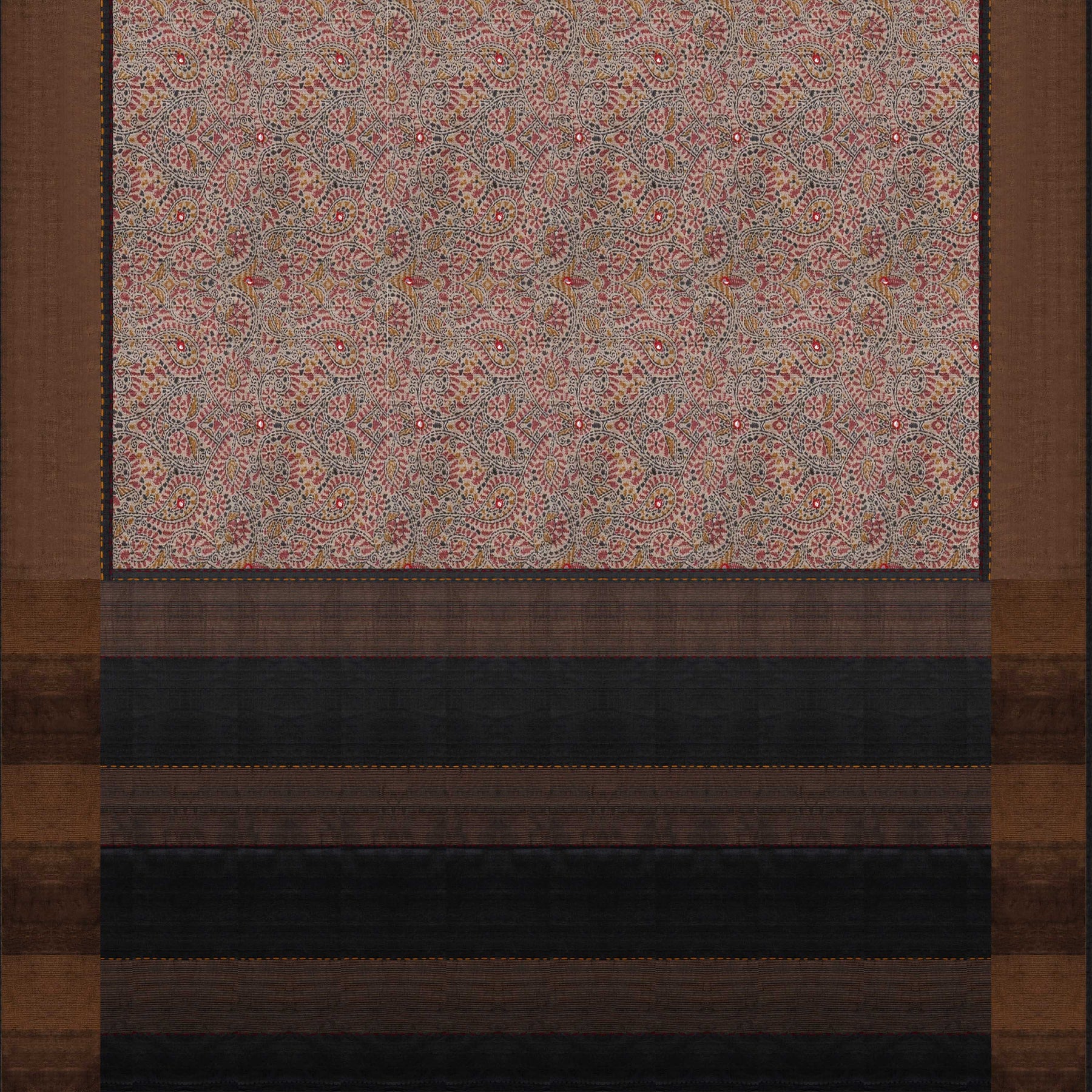 Effortlessly elegant, this printed pure Tussar silk saree features an off-white base adorned with a harmonious blend of floral vines and paisley leaf patterns, delicately detailed in dash lines and highlighted with tiny mirror embroidery for a subtle sparkle. The plain grey border is accentuated with a gold zari tissue band and intricate running stitch in yellow and red thread, adding a handcrafted charm. The pallu, in matching grey, showcases stripes and fine stitch detailing, creating a graceful finish. Woven from soft and breathable Tussar silk, this saree perfectly balances traditional motifs and modern textures, ideal for festive gatherings or refined office wear.