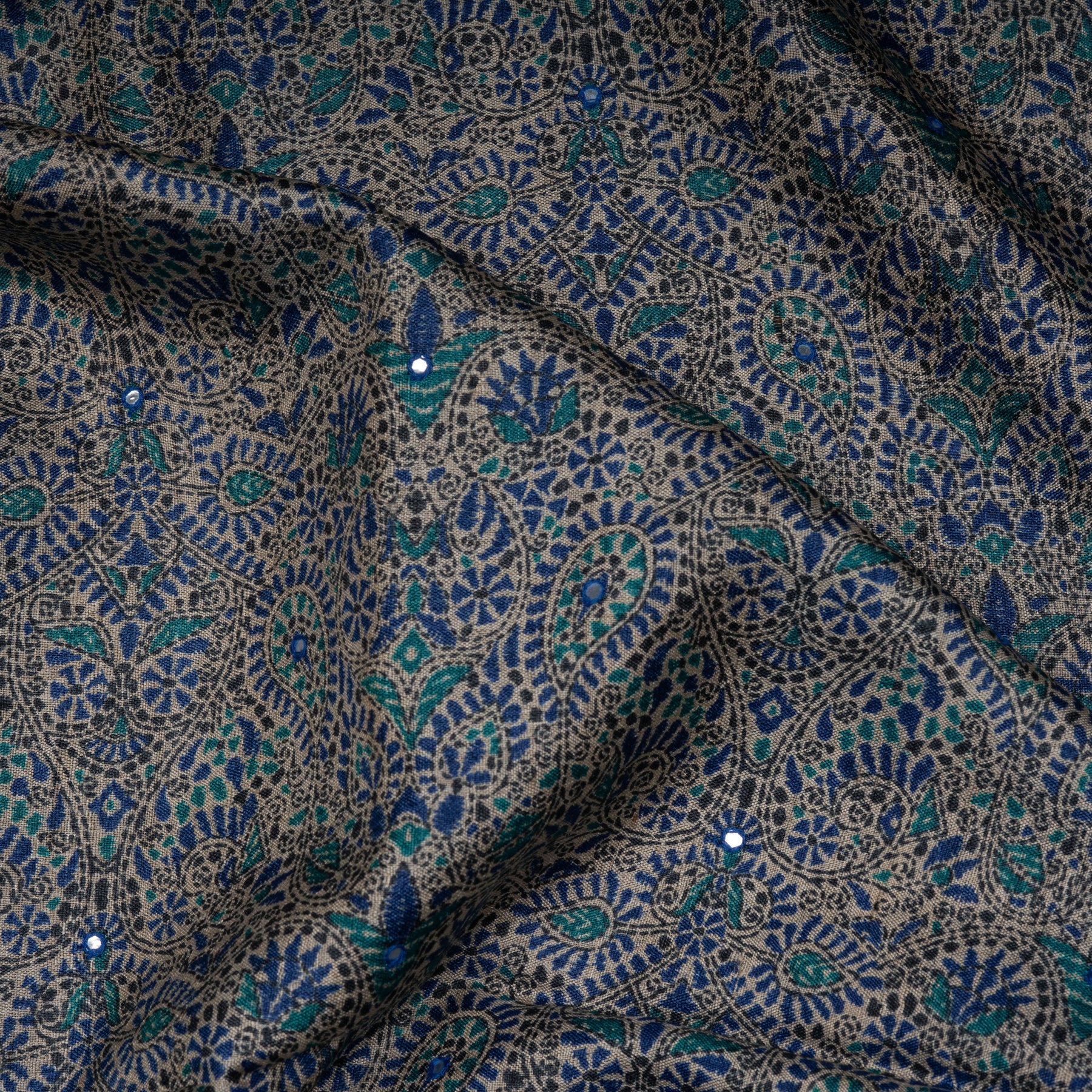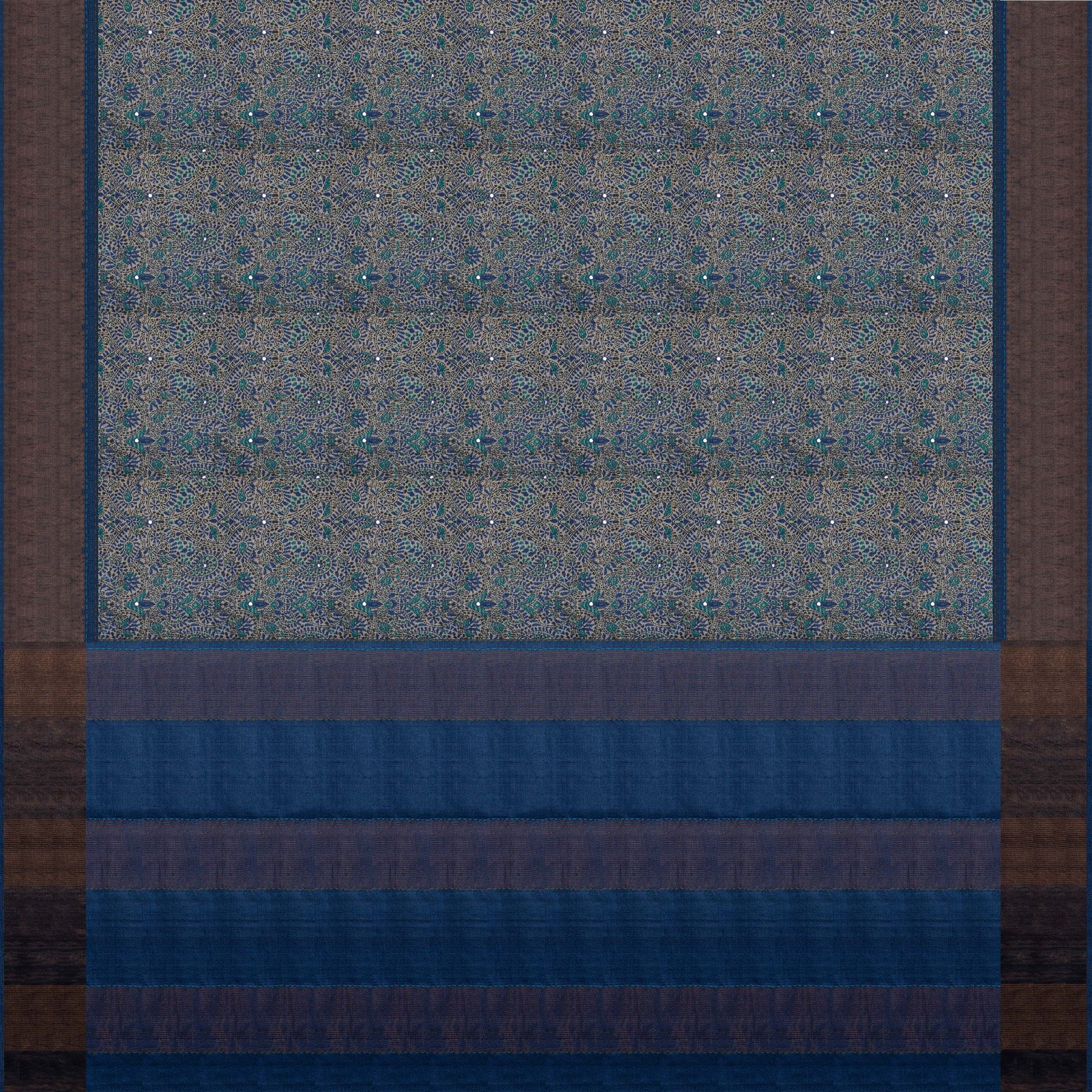 Radiating grace and sophistication, this printed Tussar silk saree features an elegant off-white body adorned with a harmonious blend of floral vines and paisley leaf patterns in delicate dash lines of blue and green. Subtle mirror embroidery adds a touch of handcrafted charm, enhancing the natural sheen of the Tussar silk. The plain blue border is enriched with gold zari tissue and intricate running stitches in blue and green thread, perfectly complementing the saree’s striped blue pallu. Crafted from pure, breathable Tussar silk, this saree effortlessly merges traditional artistry with modern appeal — ideal for festive gatherings or refined office wear.