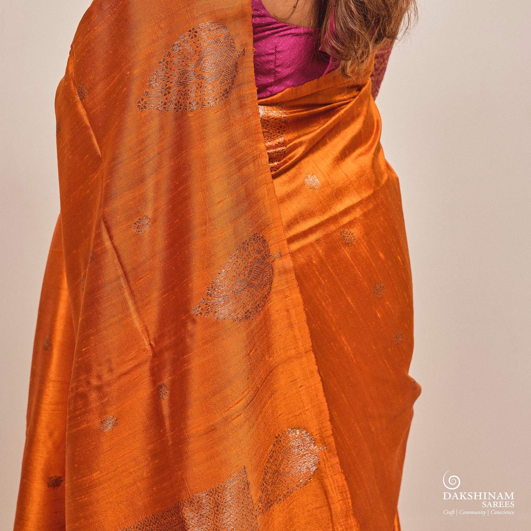 Add warmth and elegance to your collection with this exquisite Banarasi Tussar silk saree in a vibrant orange hue. Designed in a graceful borderless style, the body is adorned with delicate Tree of Life and floral buttas woven in subtle copper zari, lending it a refined traditional appeal. The monotone pallu enhances the look with scalloped leaf-inspired patterns and fine zari stripes, beautifully complementing the natural texture of Tussar silk. Ideal for festive gatherings, cultural events, and elegant day occasions, this saree reflects the understated richness of Banarasi craftsmanship.