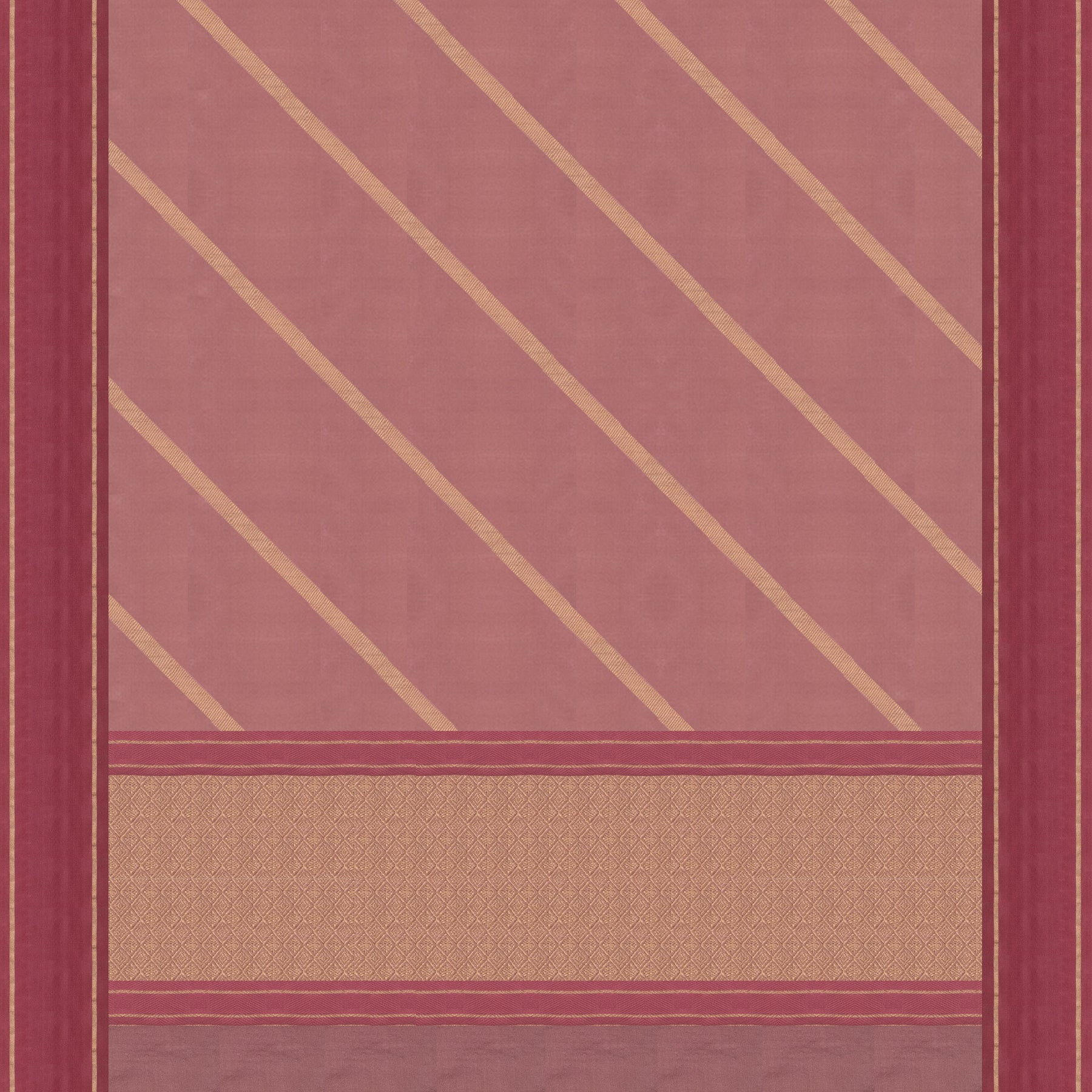 Graceful and refined, this pure handloom Banarasi Katan silk saree in pastel pink with a contrasting dark raspberry pink border and pallu is a charming pick for modern bridal and festive wear. The body features a unique band of diagonal stripes woven with gold zari, giving the drape a subtle yet luxurious texture. The plain border is elegantly finished with a single line of gold zari, offering a minimal yet regal appeal. The pallu balances the simplicity with intricate detailing in the form of stripes, diagonal checks, and traditional bavanchi patterns. The saree comes with a plain blouse piece finished with a matching border, completing the ensemble with classic elegance. A standout from our handpicked silk Katan Banarasi weaves online, this saree is perfect for weddings, intimate celebrations, and festive gatherings.