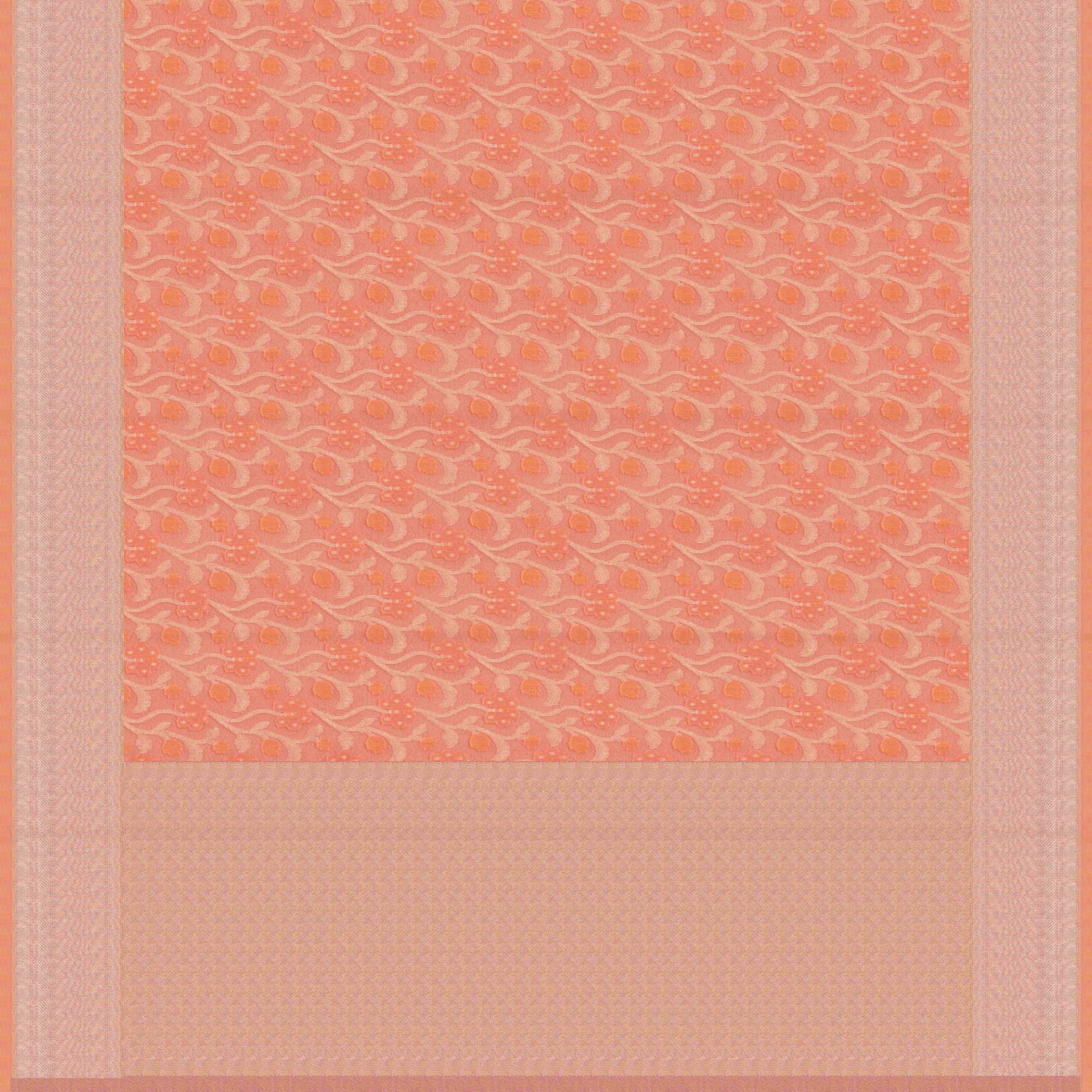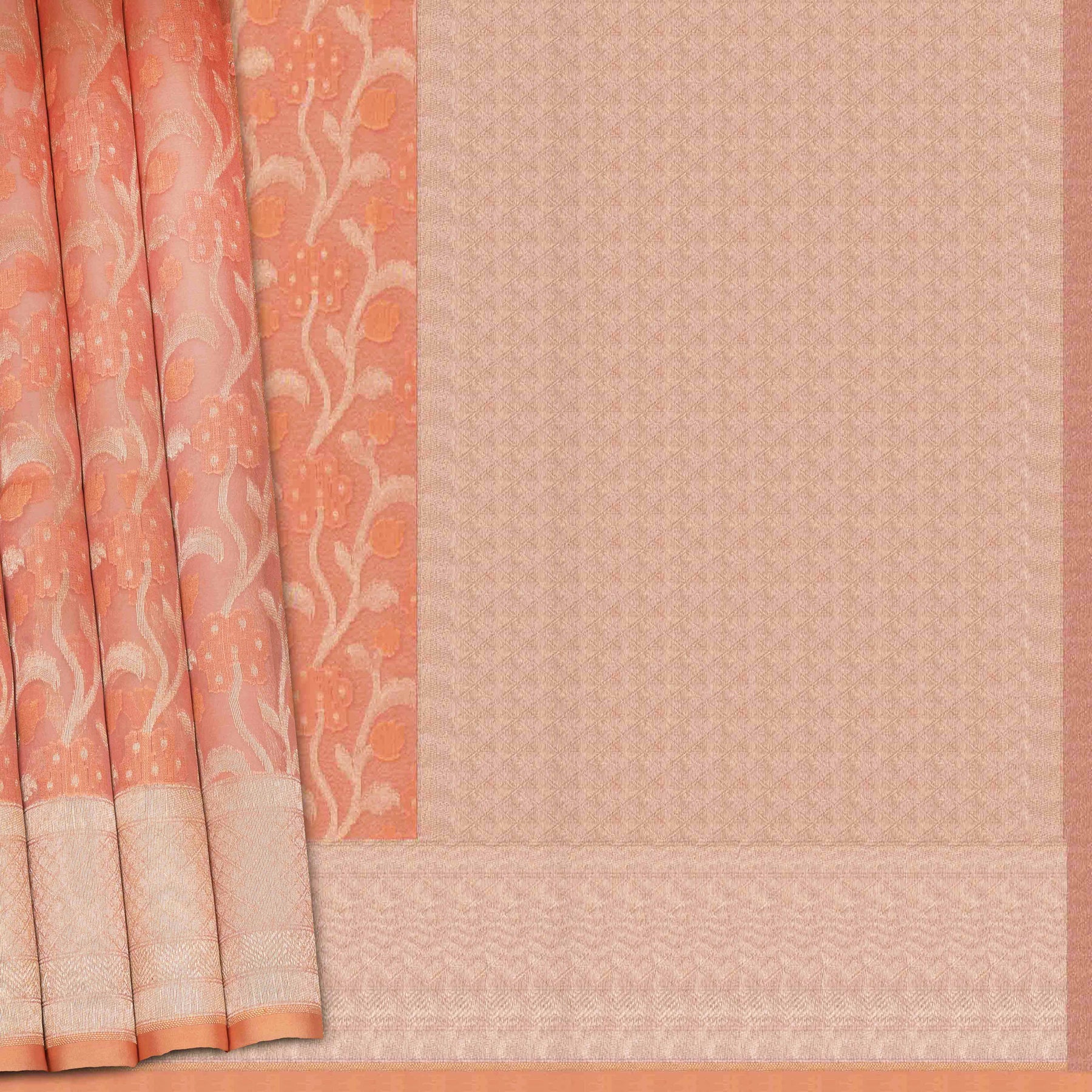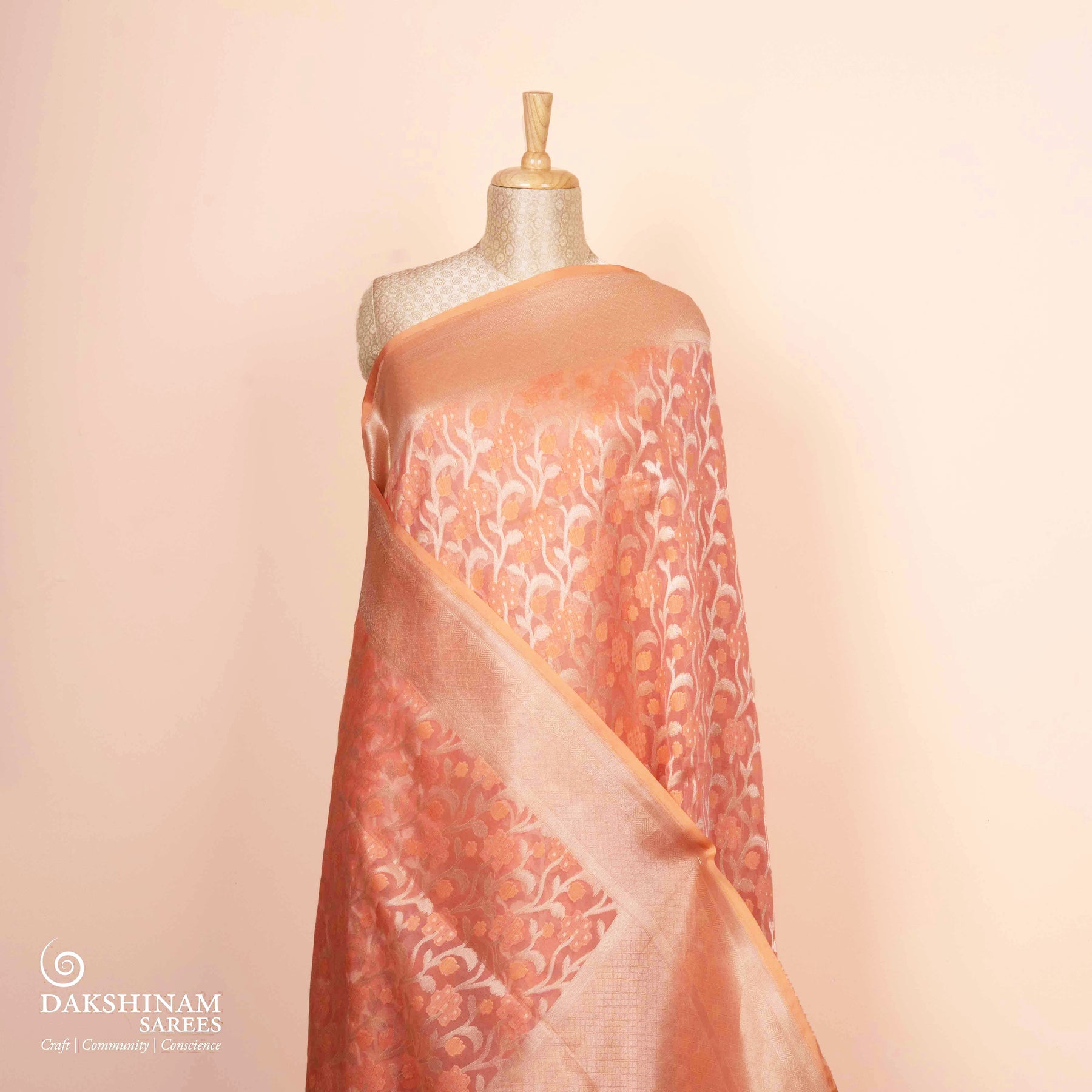 Elevate your traditional collection with this elegant peach Kora silk saree featuring delicate floral vine motifs adorned with peach florals and shimmering gold zari accents. The monotone border is embellished with diamonds, zigzags, and stripes, beautifully continuing onto the pallu for a harmonious finish. Paired with a blouse showcasing diamond-shaped brocade, chevron, and stripe patterns, this saree is perfect for weddings, festive occasions, and celebrations.