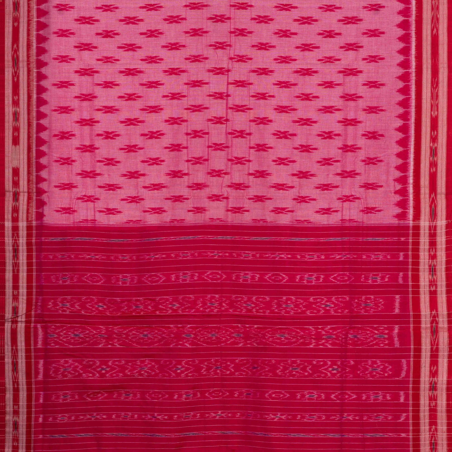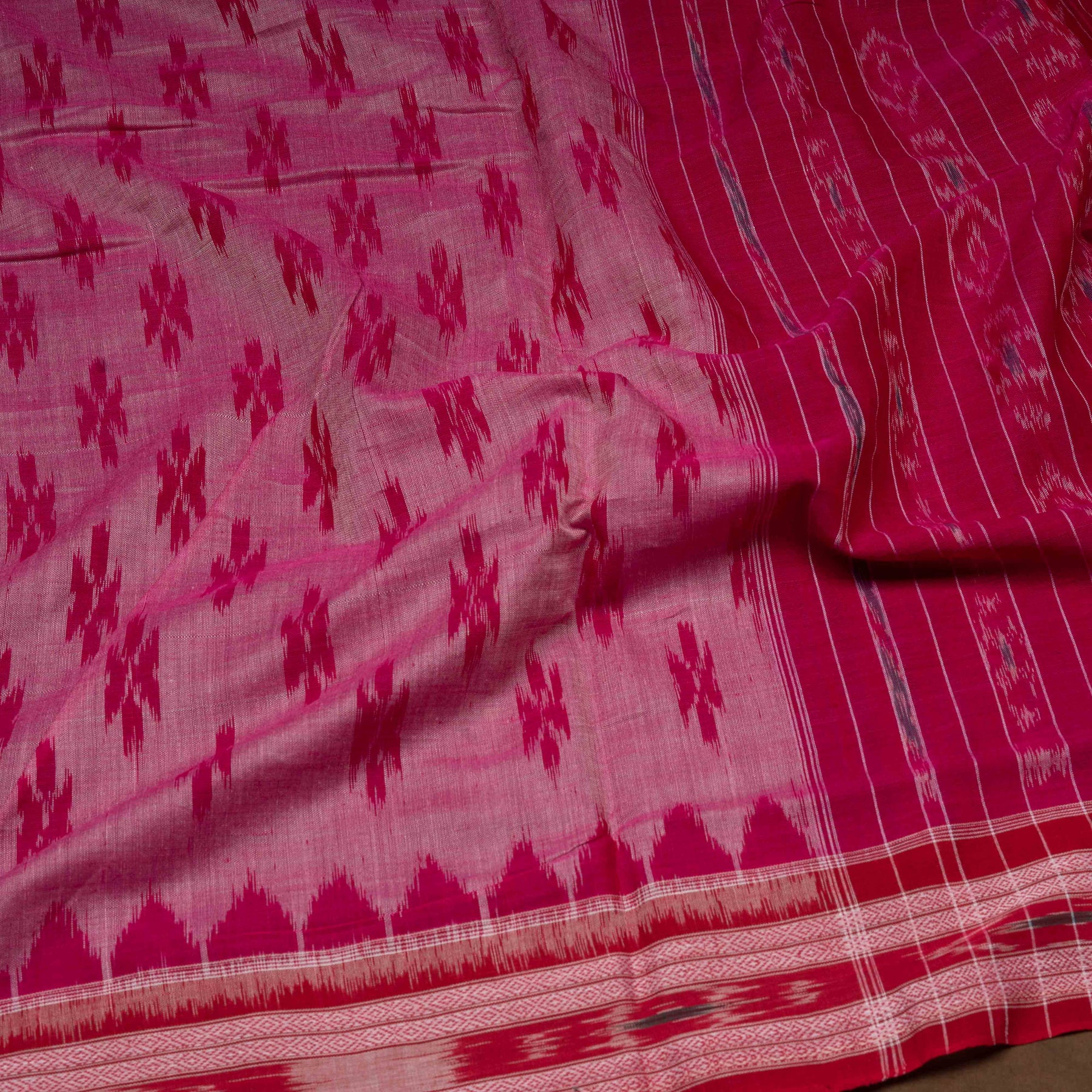 Delicate yet bold, this handwoven Ikat cotton saree features a soft pink body adorned with intricate star-shaped motifs — a beautiful representation of traditional craftsmanship. The deep red pallu adds striking contrast, embellished with floral elements, diamond-shaped patterns, and fine stripes that reflect the signature Ikat weave's precision. Free from zari, this saree highlights the natural charm of cotton and the richness of design over shine. Crafted using the age-old Ikat technique, this breathable and lightweight saree is ideal for daily elegance, festive occasions, and cultural celebrations. The saree comes without a blouse, allowing you to mix and match as desired.