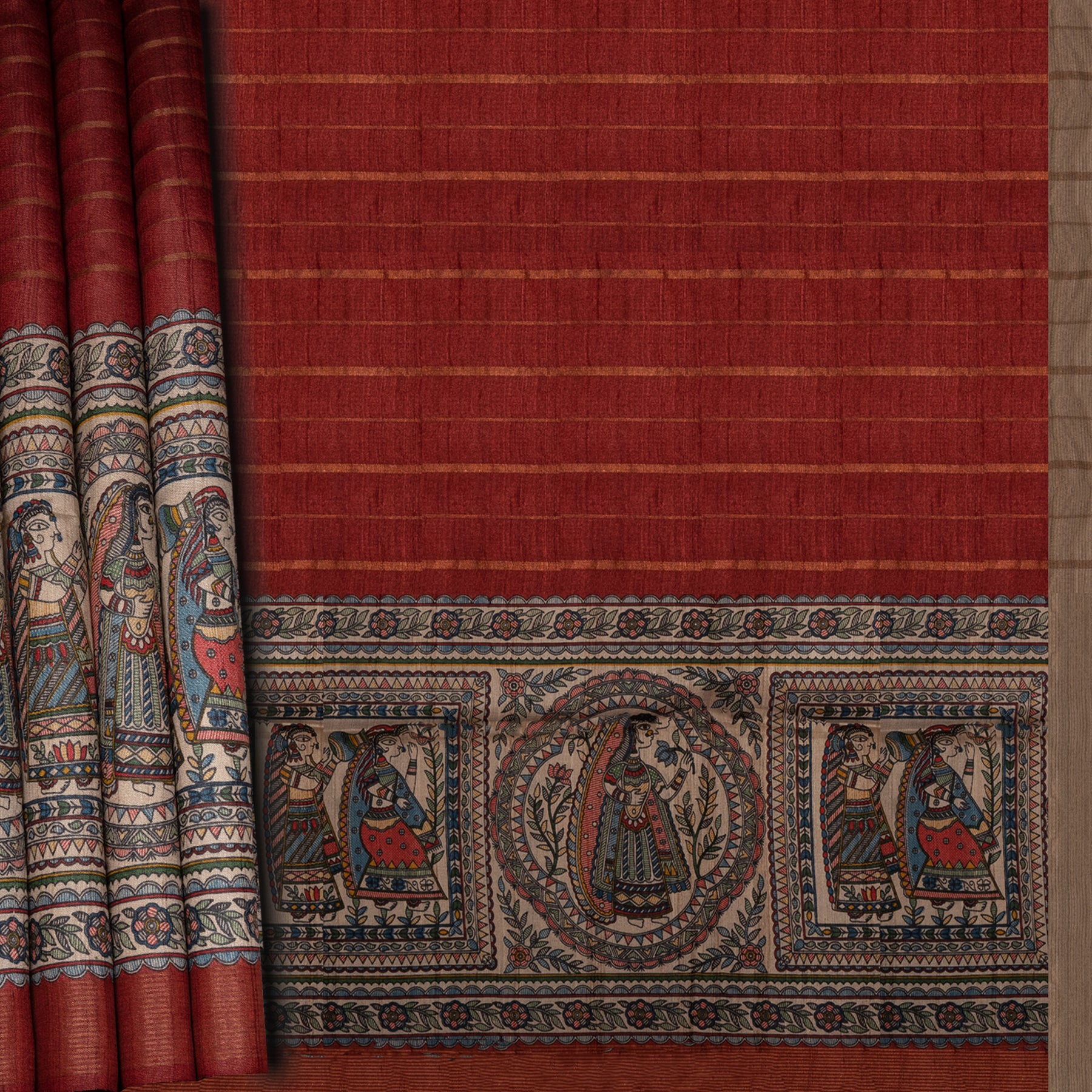 Steeped in traditional artistry, this printed pure Tussar silk saree features a captivating rust red body adorned with subtle striped patterns. The off-white border stands out with exquisite Madhubani-inspired motifs of women, florals, and leaves, highlighted beautifully with hints of gold zari. The pallu, in a deep brown tone, is finished with an elegant off-white band, adding balance and sophistication. Crafted from breathable pure Tussar silk, this saree blends folk-inspired charm with modern refinement, making it an ideal choice for festive wear or elegant day events.