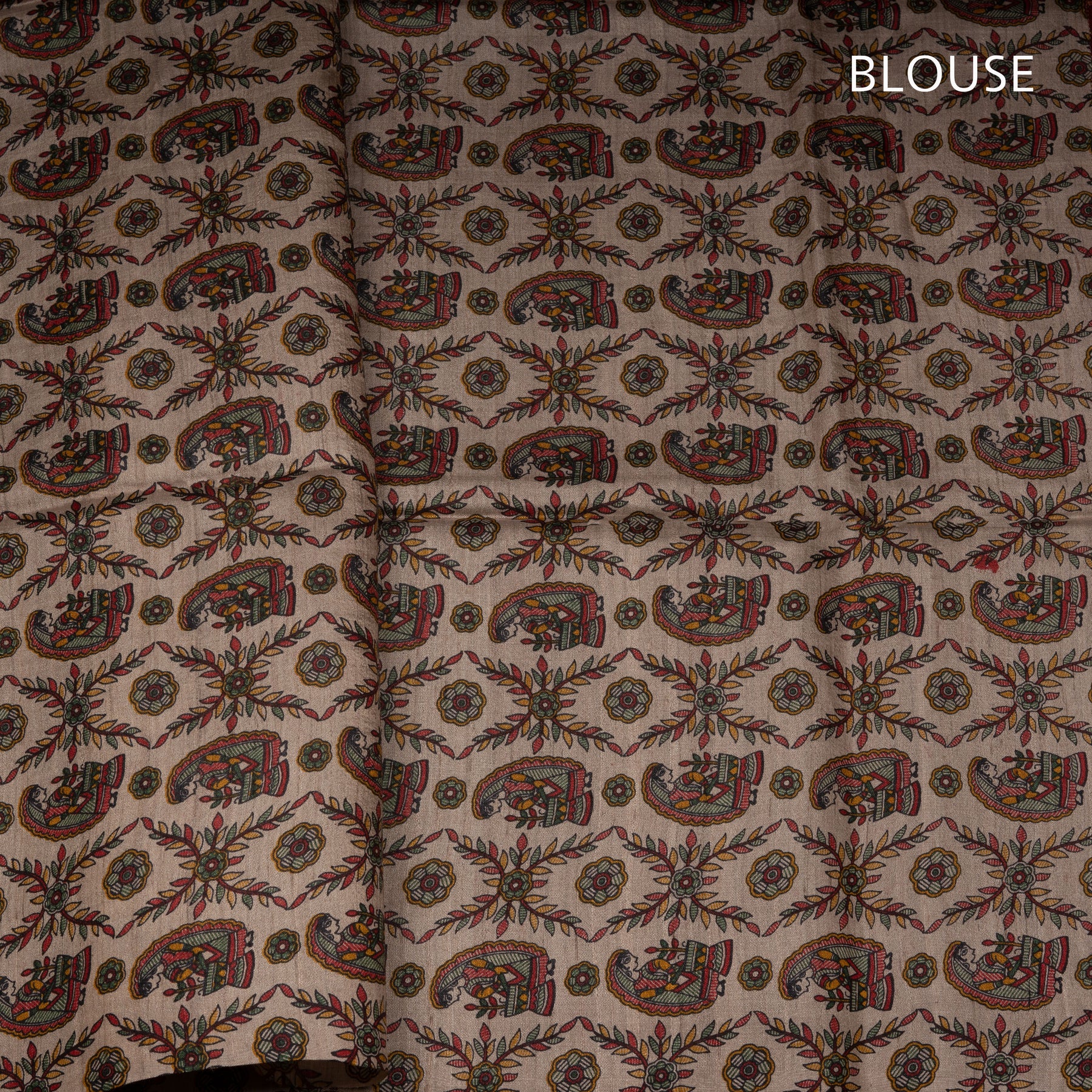 Blouse: Off-white blouse with printed Madhubani figurative motifs and matching border.