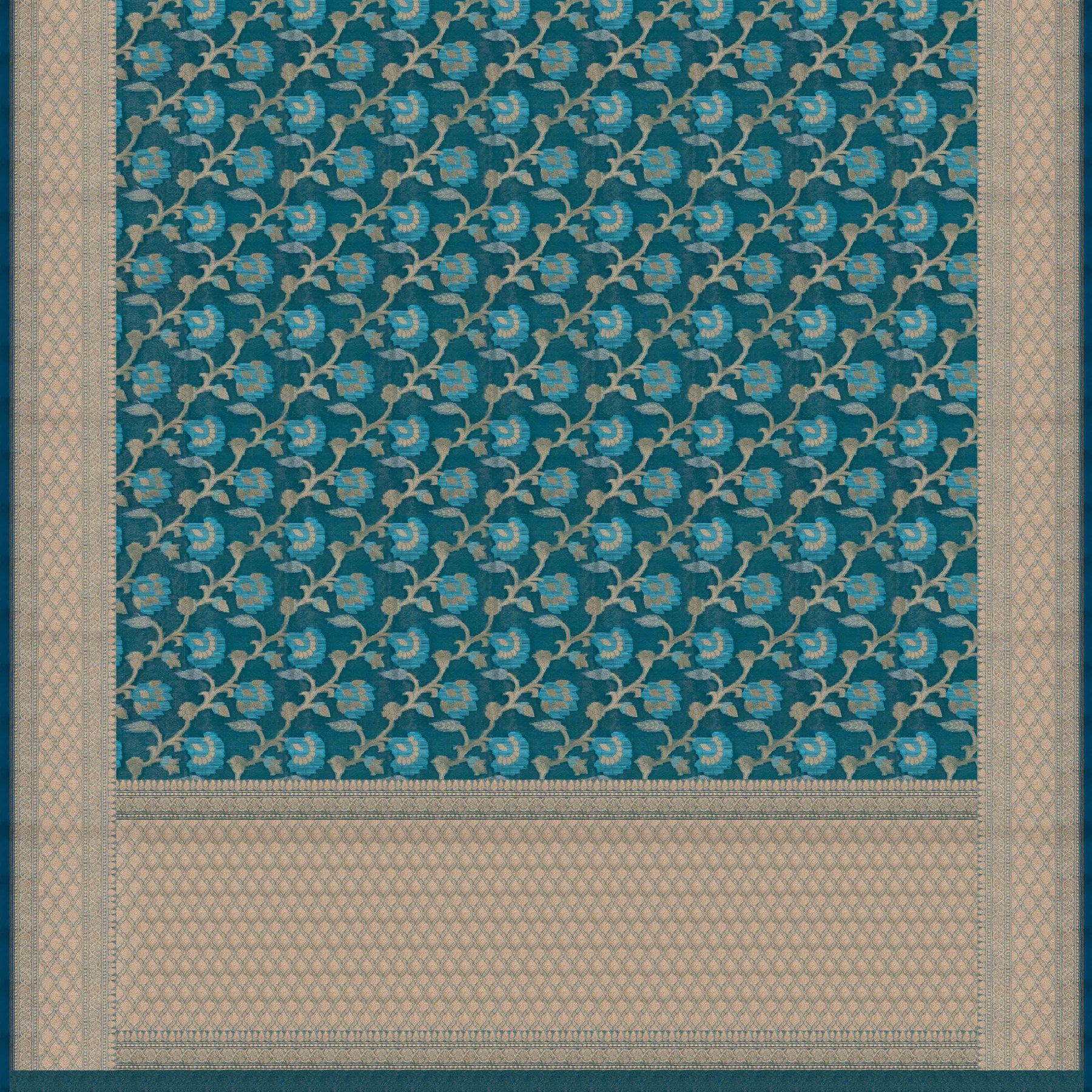 Elevate your festive wardrobe with this elegant teal blue Kora silk saree, featuring delicate floral vine motifs in light blue complemented by luxurious gold zari leaves and vines. The monotone border beautifully showcases rudraksha beads, floral vines, dots, and stripes, seamlessly continuing onto the pallu. The blouse is designed with a sophisticated diamond check brocade pattern, enhanced by dots, triangles, and stripes, making it an ideal ensemble for traditional and celebratory occasions.