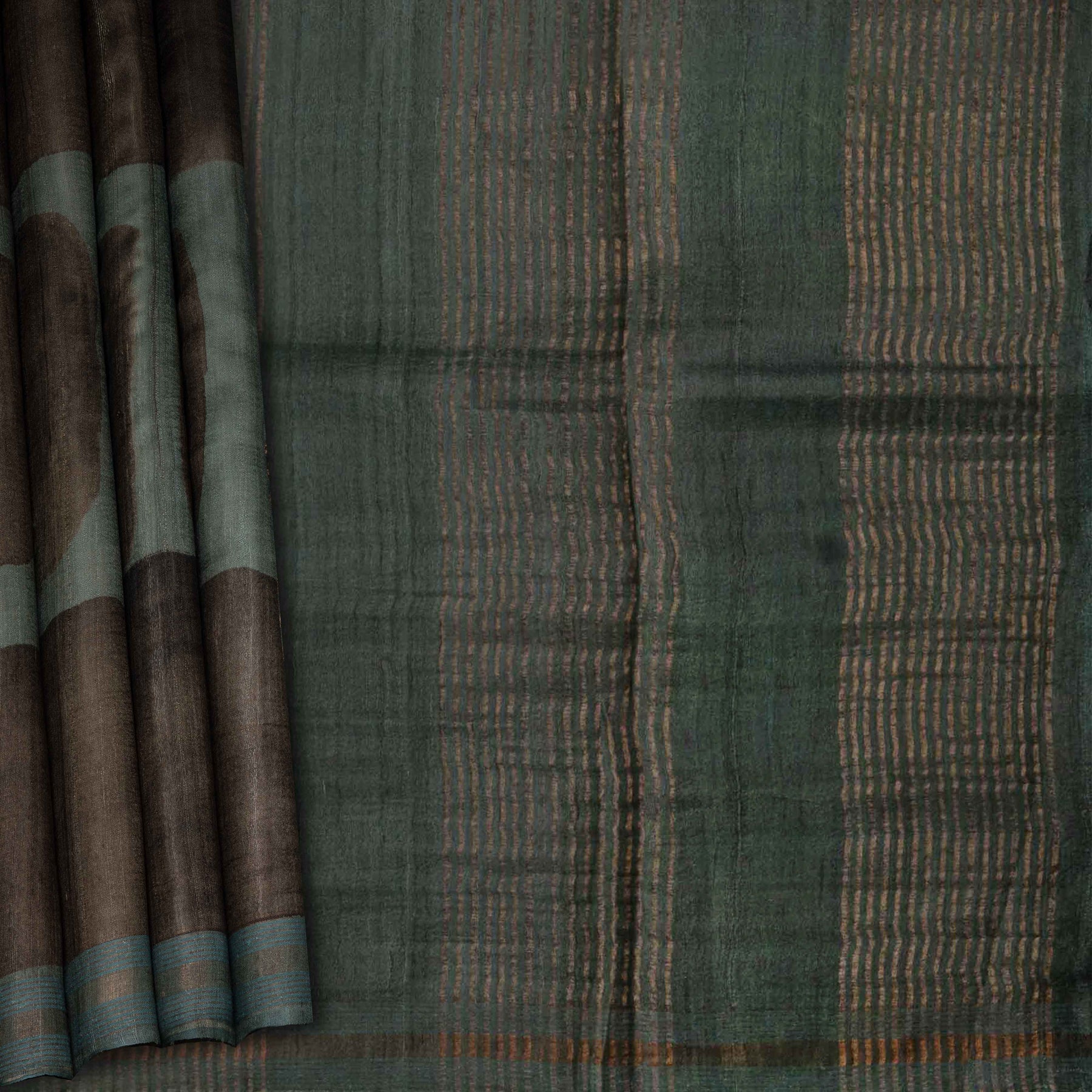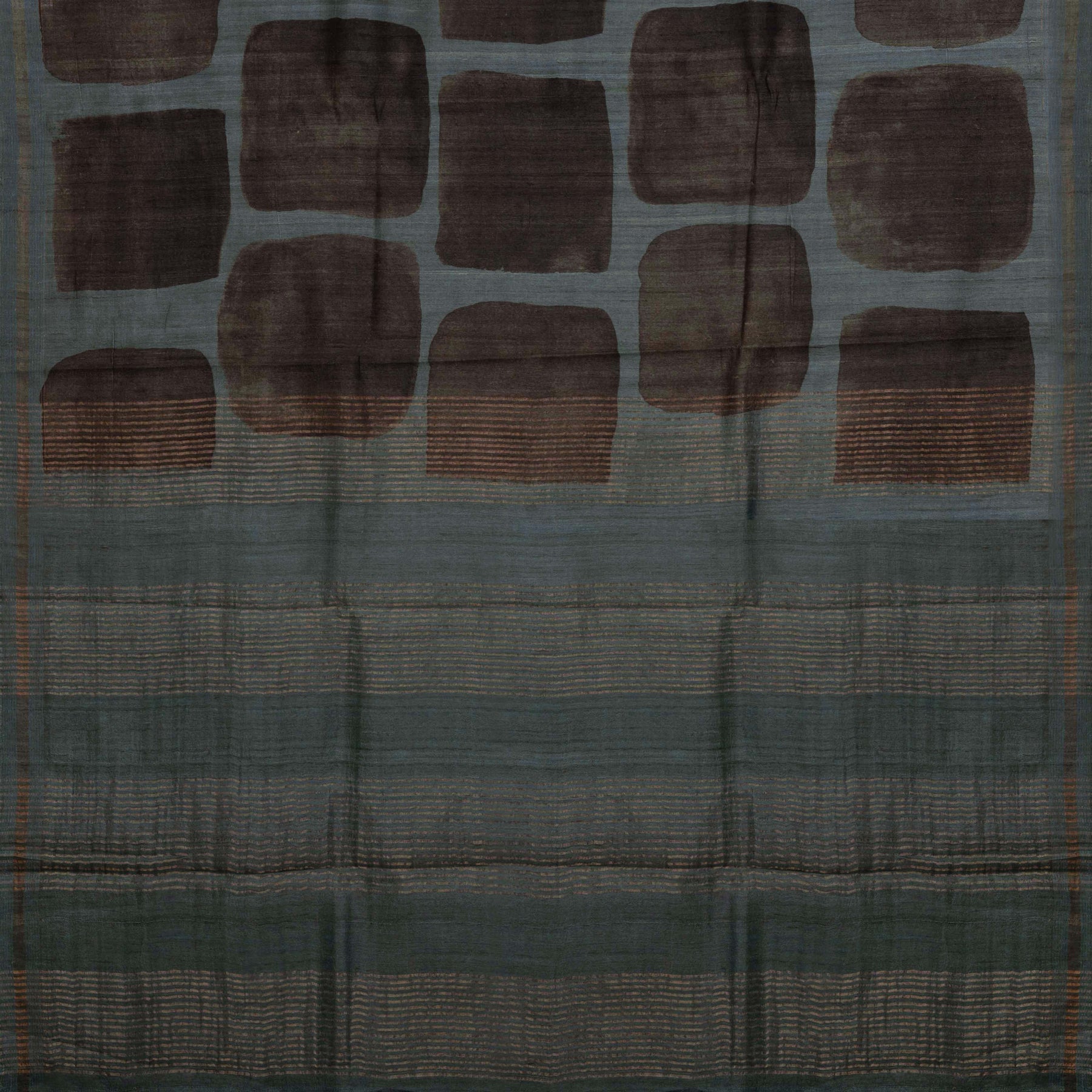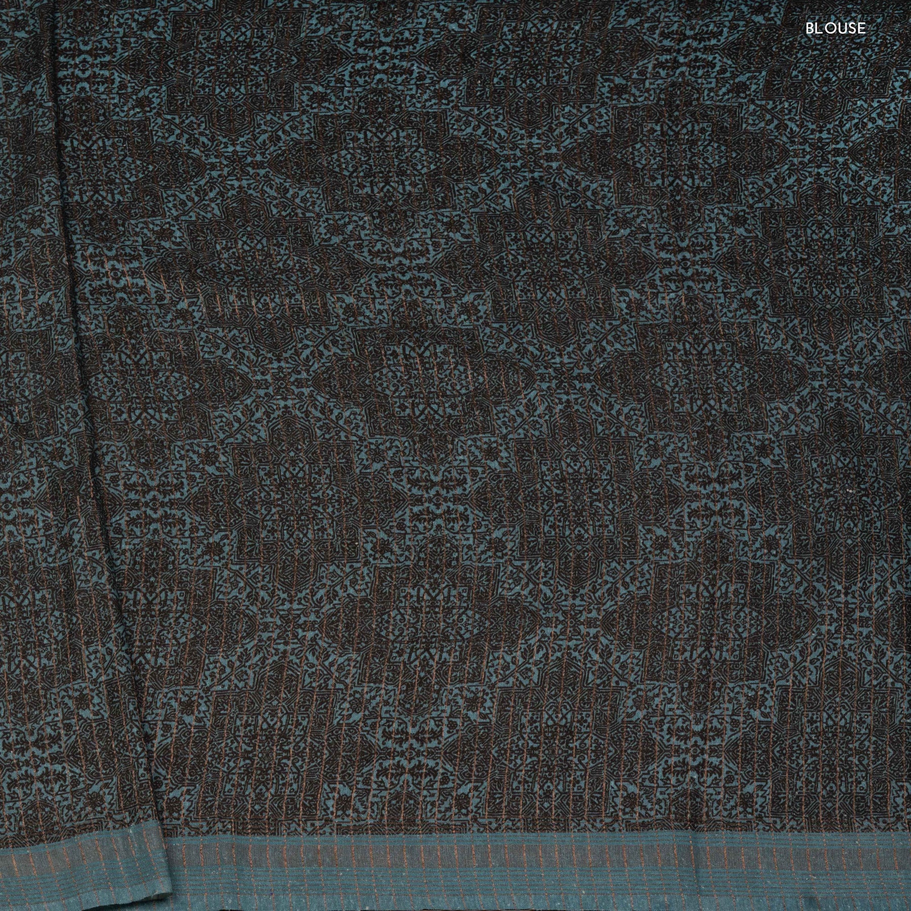Sophisticated and contemporary, this breathable pure Tussar silk handloom saree features a soothing greyish teal blue base with a distinctive rectangular curved edge print in deep grey, creating a subtle yet striking pattern across the body. The monotone border is elegantly simple, accented with delicate copper zari stripes that add warmth and shimmer without overpowering the design. The pallu continues the theme with refined copper zari stripes, harmonizing perfectly with the saree’s understated elegance. The accompanying blouse is designed with a diamond-shaped pattern highlighted by copper stripes, completing the ensemble with modern finesse. This saree from our festive-ready zari-bordered printed Tussar silk sarees collection is ideal for office wear, festive occasions, or stylish day events, offering both comfort and timeless style.