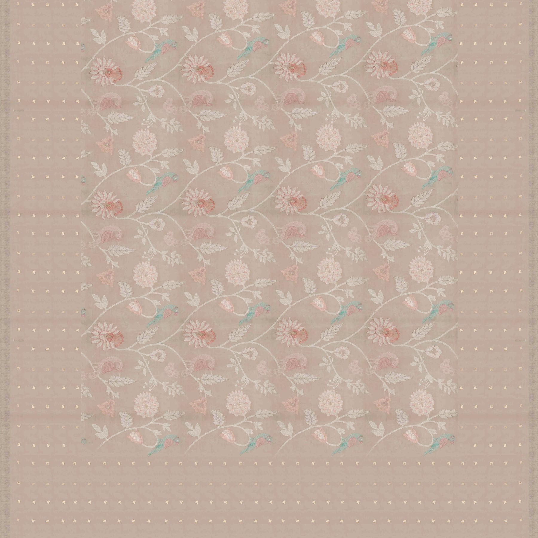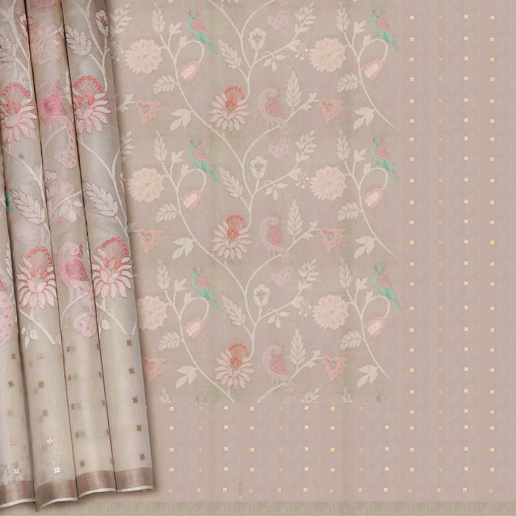 Grace and subtle luxury define this exquisite Matka Organza silk saree in a serene white shade. The body features delicate peacock and floral embroidery that adds a timeless elegance, while the gold zari border and pallu are beautifully embellished with woven sequins, creating a subtle shimmer that catches the light perfectly. The saree’s raw texture and breathable Matka silk fabric make it ideal for wedding guests and bridesmaids looking for understated yet sophisticated attire. The accompanying blouse is designed with classic stripes, enhancing the overall aesthetic of this elegant handloom saree.