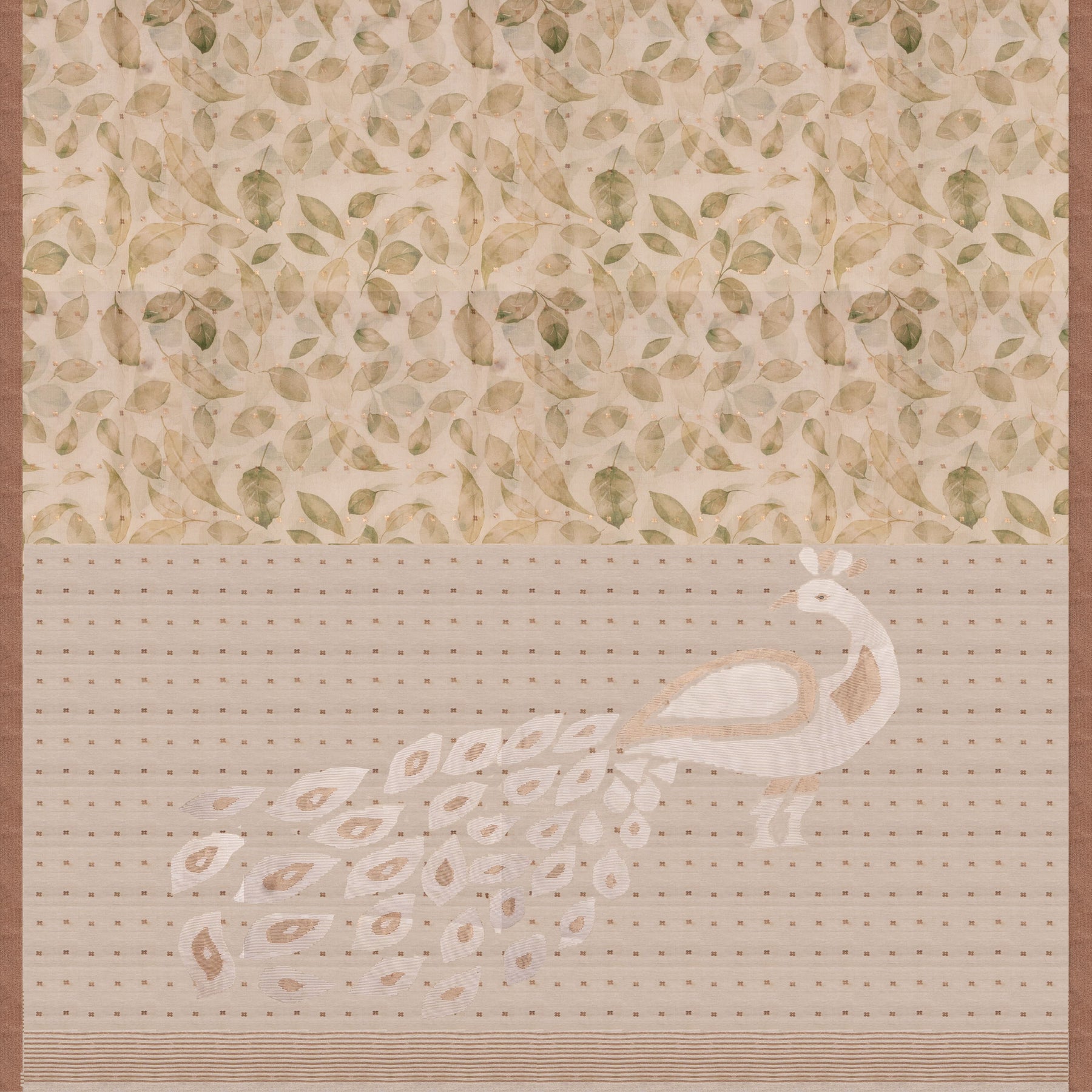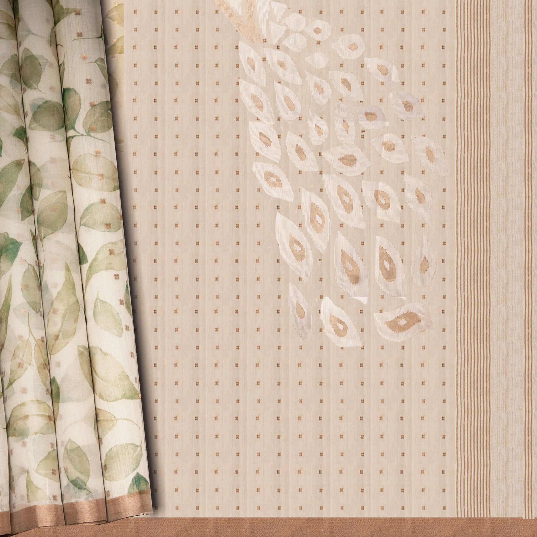 Graceful and ethereal, this white Matka Organza silk saree is a stunning pick for wedding guests and bridesmaids who appreciate elegance with a touch of artistry. The soft organza base is enhanced with leaf-printed patterns and delicately woven floral sequins, offering a refined shimmer. A thin gold tissue border adds subtle richness, while the white pallu, crafted using the Jamdani technique, features a beautifully woven peacock motif and scattered sequins that elevate its visual appeal. The saree is paired with a plain Matka silk blouse finished with a gold tissue border, making it a perfect ensemble for special occasions.