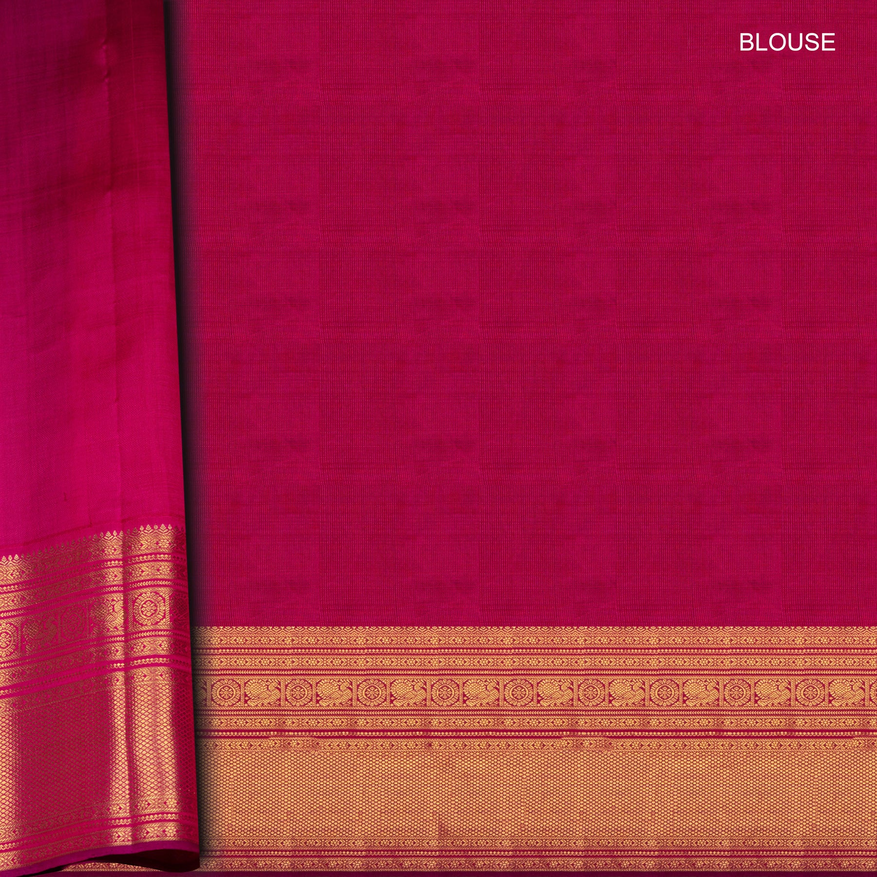 The saree comes with a pink blouse featuring the same ornate border, completing the look with a regal finish ideal for festive and wedding wear.